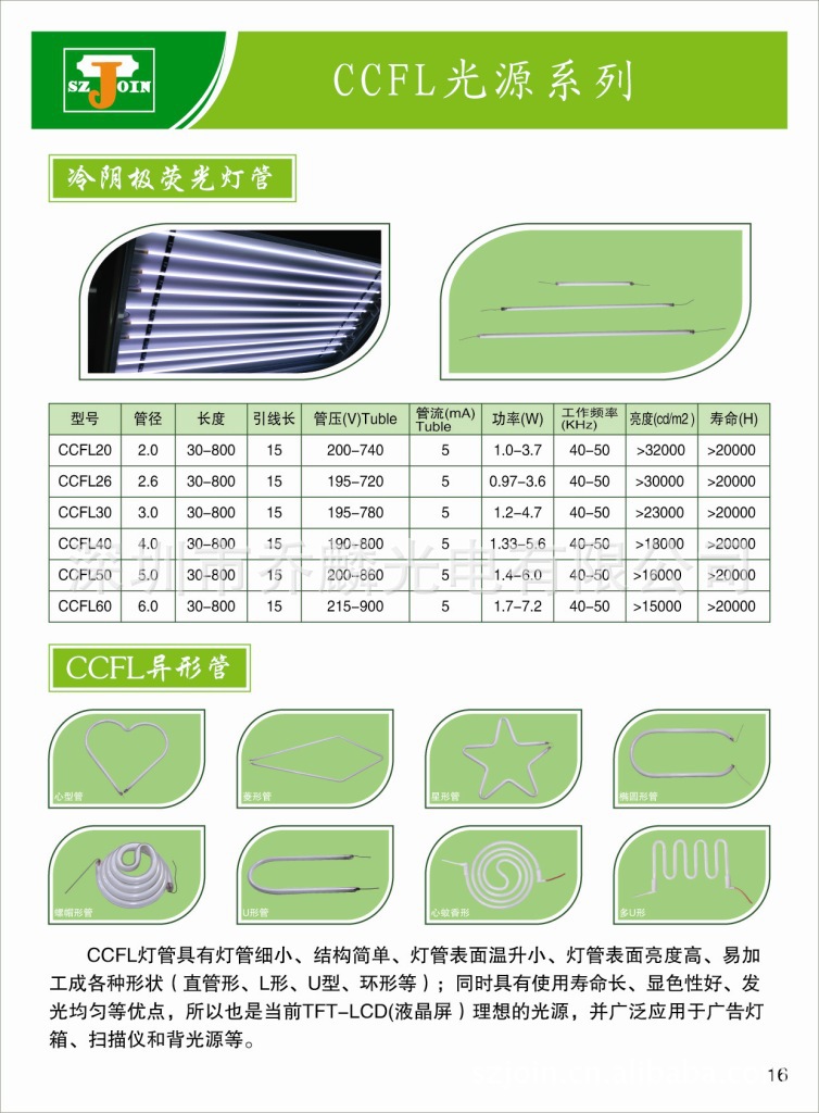 深圳市喬麟光電有限公司生產的CCFL產品為 LCD 背光模組 .背光板.超薄燈箱.掃描機.應急燈.驗鈔機.室內照明.裝飾工程等廠傢提供光源。產品體積小、重量輕、顯色性好、發光均勻等優點,顏色: 冷白光,暖白光,紅色、綠色、藍色.......材料:硬料電療,肖特玻管