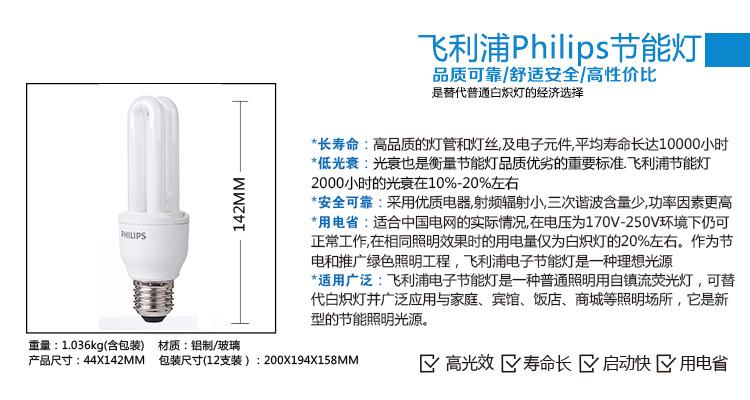 標準型節能燈8W/E27白熾燈色12支裝 品牌:Philips/飛利浦 | ![]() |