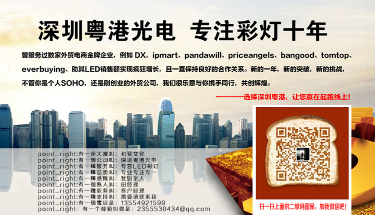 深圳粵港光電有限公司位於中國電子之都,是一傢集研發,生產,銷售為一體的專業彩燈製造廠。主營產品為LED彩燈燈串,LED彩虹管,護欄管,米燈,LED網燈,LED窗簾燈,LED流星雨,LED瀑佈燈,電池燈,盆景造型樹燈,舞臺背景裝飾燈,城市規劃裝飾燈等系列。本公司擁有全套國際先進自動化設備,生產製程嚴格按照IS09001《2000》管理程序運作管理,加上訓練有素的員工及管理隊伍,以確保本公司能在最快的時間內以“最優良的品質,最合理的價格,最完美的服務”來滿足客戶的要求。