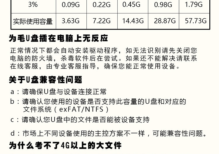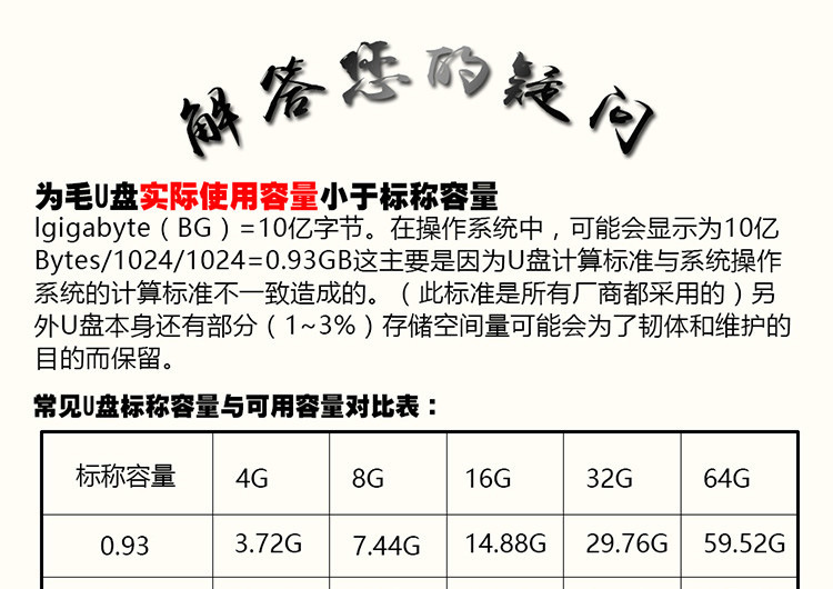 因為計算機與芯片製造商采用的計數不同,所以隨身碟容量與標記不符,一般是比較容量的0.9左右,這為正常現象,請您放心。再者,本司經營的全都是足量隨身碟,請您放心購買。