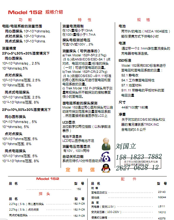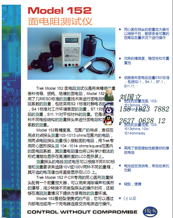 The Trek Model 152-1 Surface/Volume Resistance Meter is designed to precisely measure surface or volume resistance on a wide variety of conductive, dissipative, and insulative materials. It features exceptional measurement accuracy and wide measurement ranges. When used with Trek’s uniquely designed 152P-CR-1 concentric ring probe, the instrument provides consistent ease of operation even at very high resistance values. The Model 152-1 is lightweight, portable and operable via batteries or an AC line power source with battery eliminator.