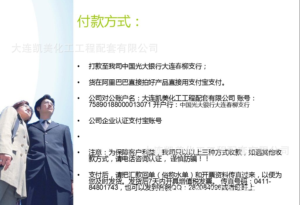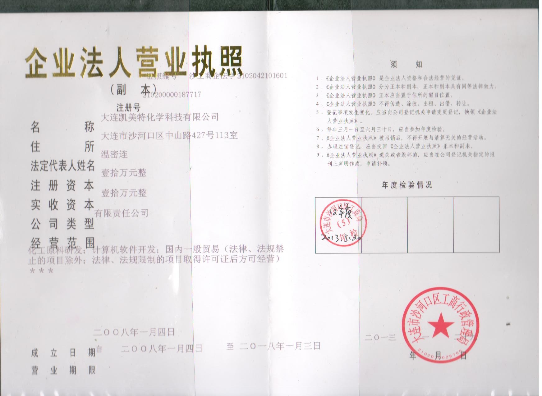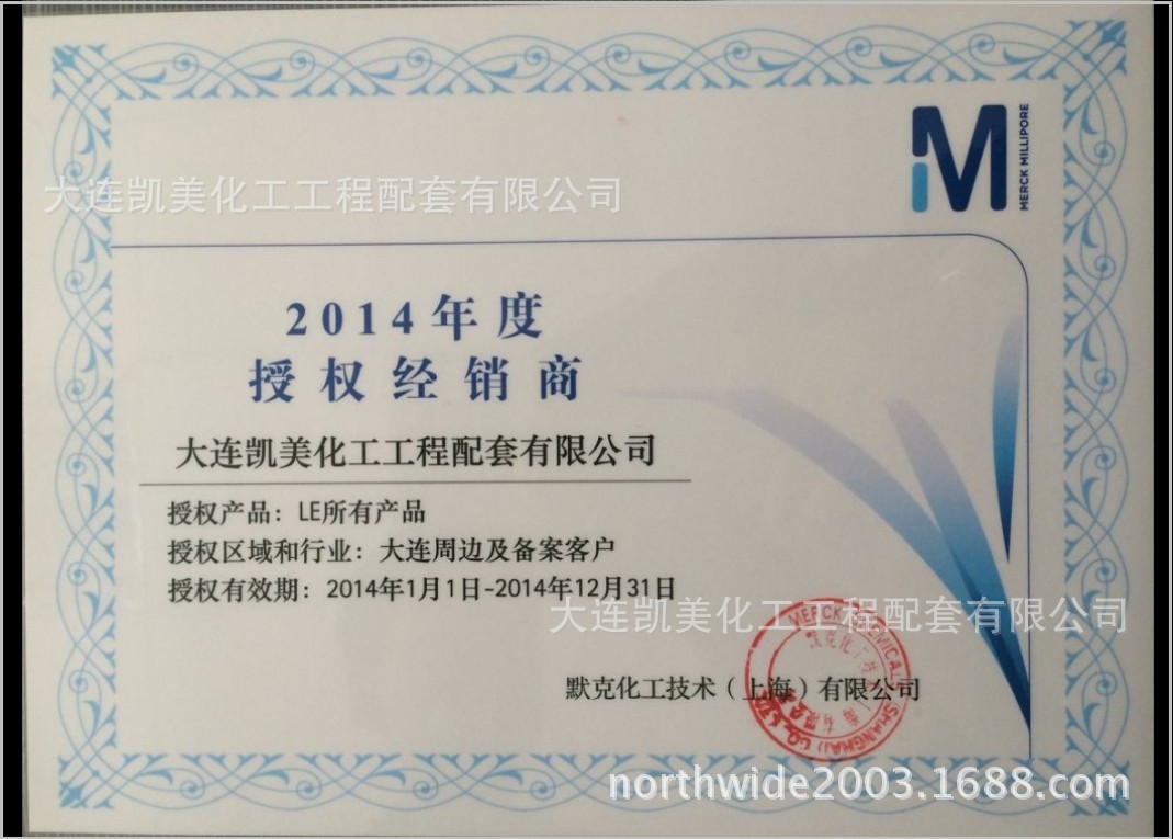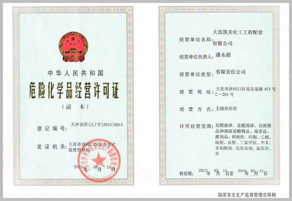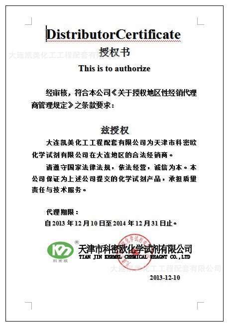 - 大連凱美化工工程配套有限公司(原大連北疆化學工程有限公司) 坐落於美麗的海濱城市—大連,是一傢經營化學試劑、玻璃機器、實驗耗品、機器設備等產品的全國性專業經銷商,有齊全的危險化學品及易製毒化學品銷售許可證。經過多年的市場化錘煉已經形成一條完善的、快捷的供貨及銷售渠道,由於公司擁有自營進出口權,國外的知名品牌也將凱美化工視為可靠的、有價值的合作夥伴。
