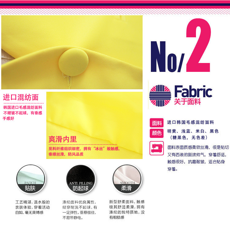 | 指標參數/Parameter | 春天,屬於小西裝的季節。這個秋天,難擋色彩的誘惑,接連推出瞭好幾款糖果亮色系小西裝外套。 這一款明黃,是心底的大愛。不是懷舊的薑黃,不是華麗的金黃,而是乾凈得沒有一絲雜質的,純粹的明黃色。我始終認為,這是一種讓人一看就莫名地感到開心的顏色,它與生俱來的積極氣質,充沛的活力,產生出強烈的吸引。不相信?那就做個試驗吧。在一大群人的各色著裝中,這個顏色絕對是最突出的,最能讓你停留目光的! 選定瞭這樣一個完美的色系,在西裝的細節上,就不需要有太多浮華和繁瑣的設計瞭。簡潔流暢的線條,方能襯托出它的大氣。領子很費心思,從後頸看是小立領造型,清爽利落。前麵則是帶有一定弧度的V字形,添瞭幾分淡淡的柔美女人味。一粒扣,扣子與衣身同色,袖口卷邊的印花進一步豐富瞭整體的視覺,有種商務與休閒並存的味道。