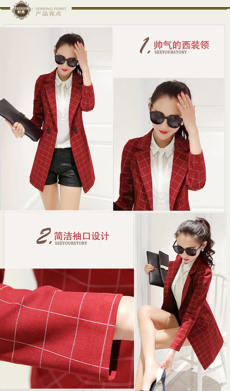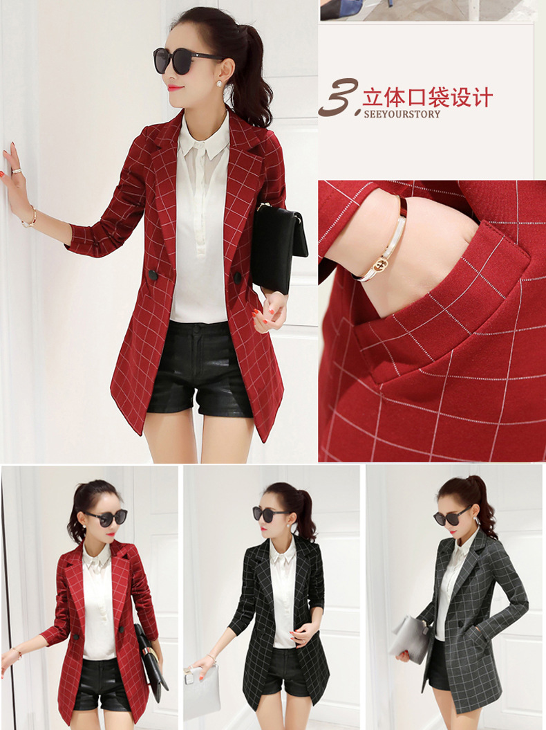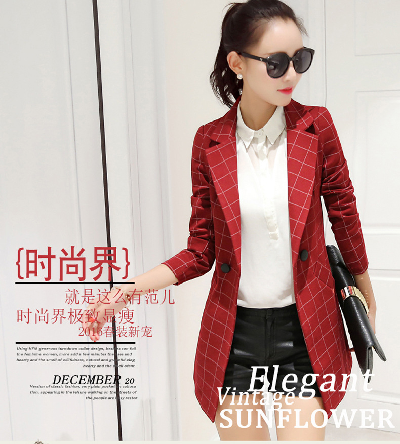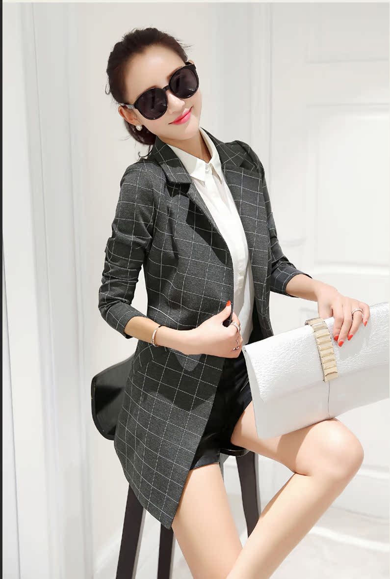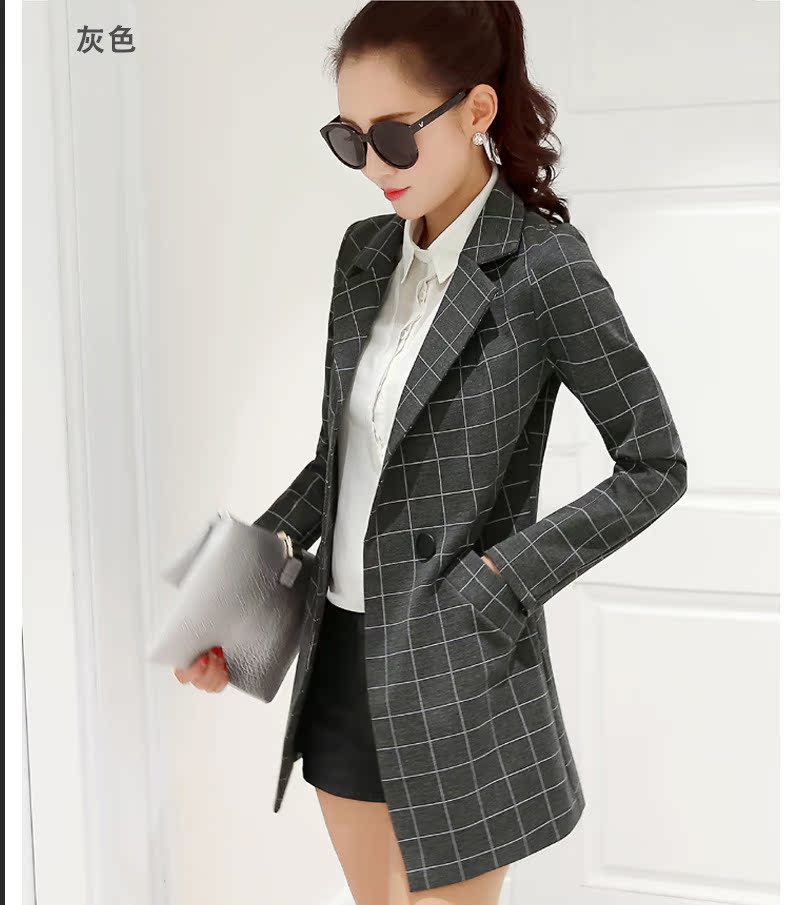 小西裝女2016春裝新款中長款韓版修身格子女士小西服大碼春秋外套