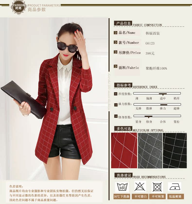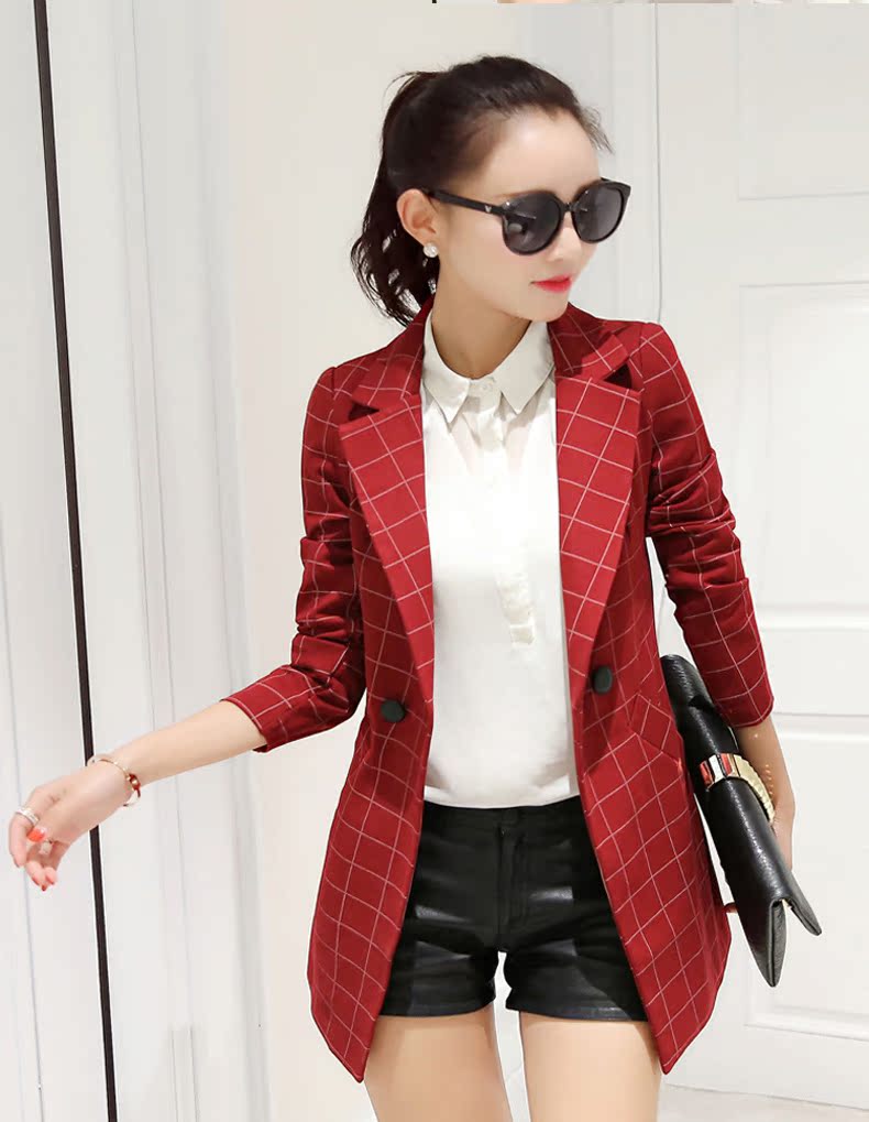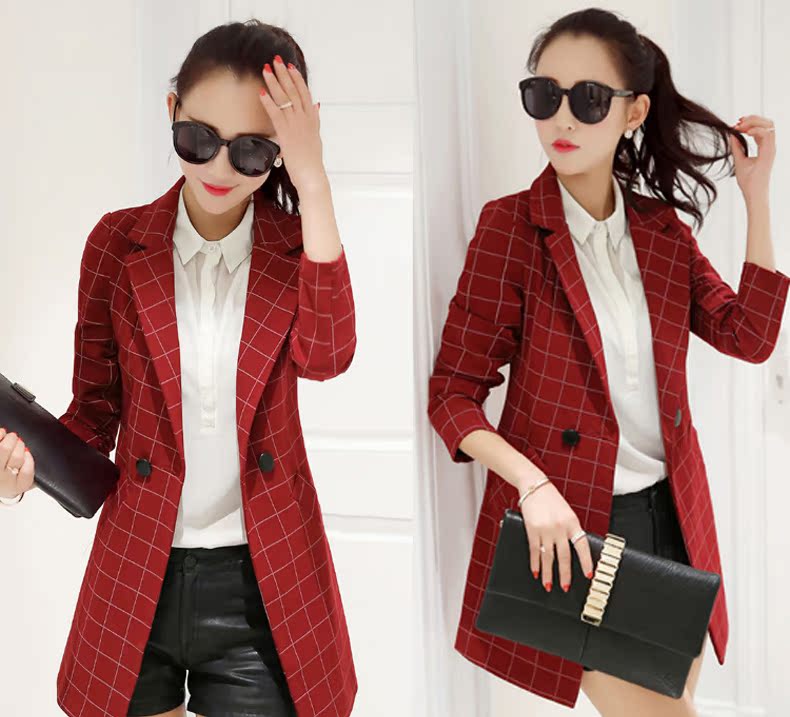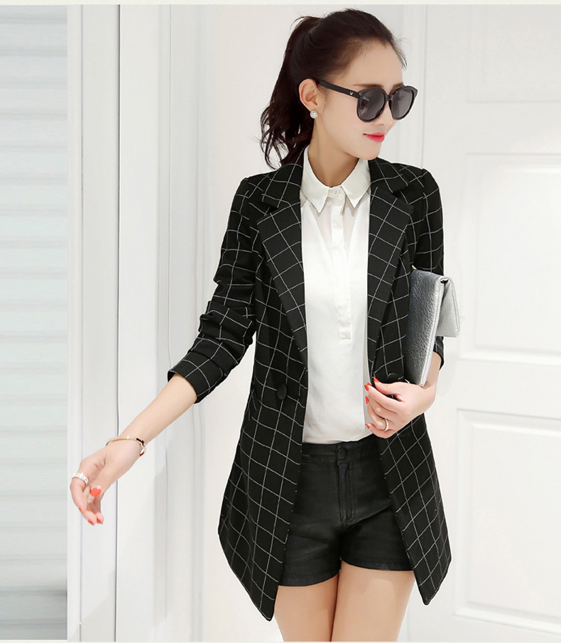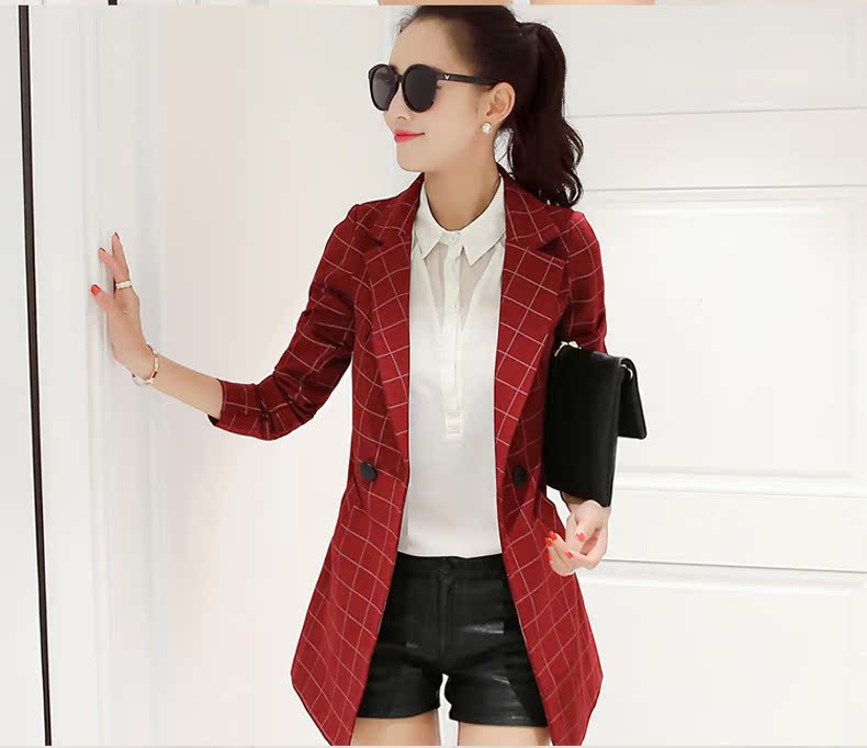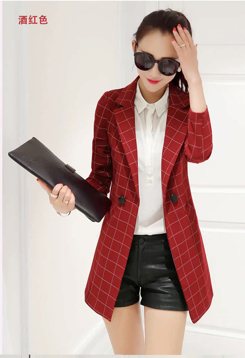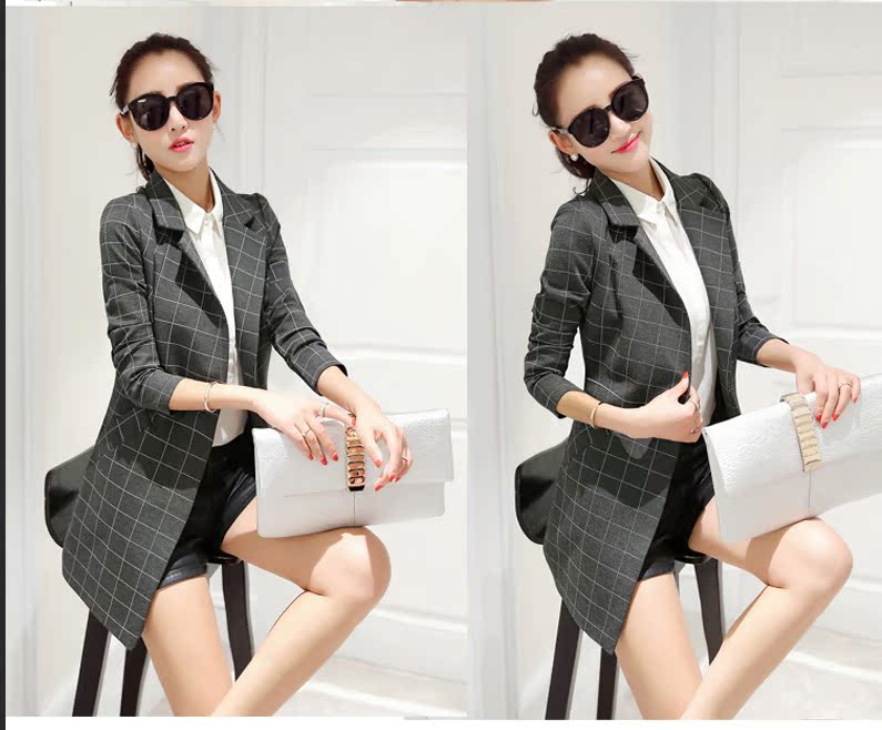 小西裝女2016春裝新款中長款韓版修身格子女士小西服大碼春秋外套