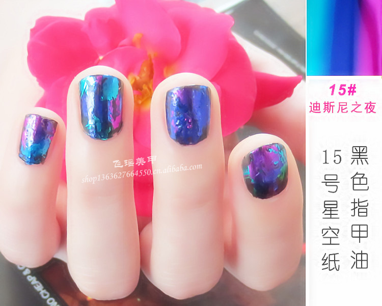 1、先將星空紙用剪刀剪成小片,不必太大瞭,約2--4CM一小片即可。與操作光療甲油膠同樣的步驟,先塗底膠,光療燈照幹;