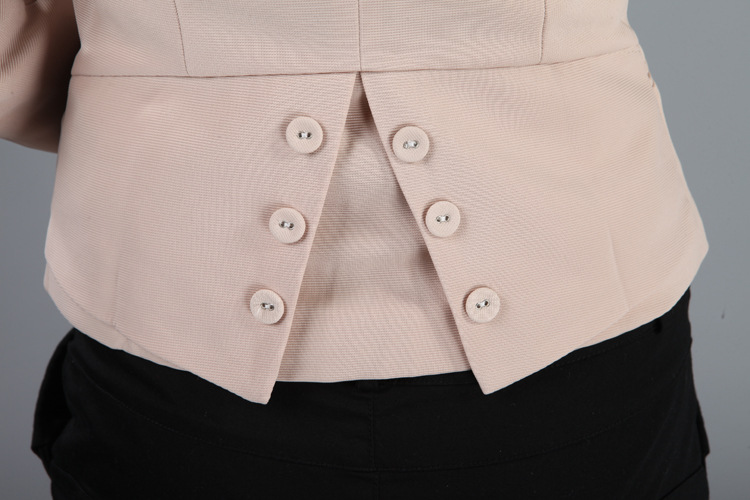 此款做工精致,麵料采用韓國粘纖免燙麵料,麵料很顯檔次.隨便怎麼洗,永不起皺,(此麵料在某些知名品牌上常采用)韓版修身版型,全襯裡佈,外邊下麵2個口袋都是真口袋,可以拆開,泡泡袖的設計很有女人味,很適合白領上班做為通勤裝穿著.淘寶上要麼價廉質次的低端商品一大把,要麼是質量稍好些的動輒大幾百的所謂精品.本店推出此款,就是要填補此間的空檔,告別暴利,讓追求性價比的白領MM,既能買到麵料有質感,做工細致質量有保證的一款小西裝.此風格質量麵料可媲美各大商場的品牌商品哦.