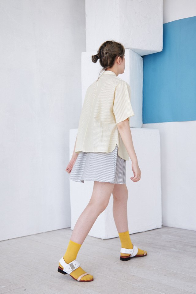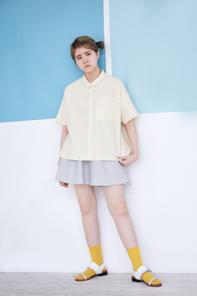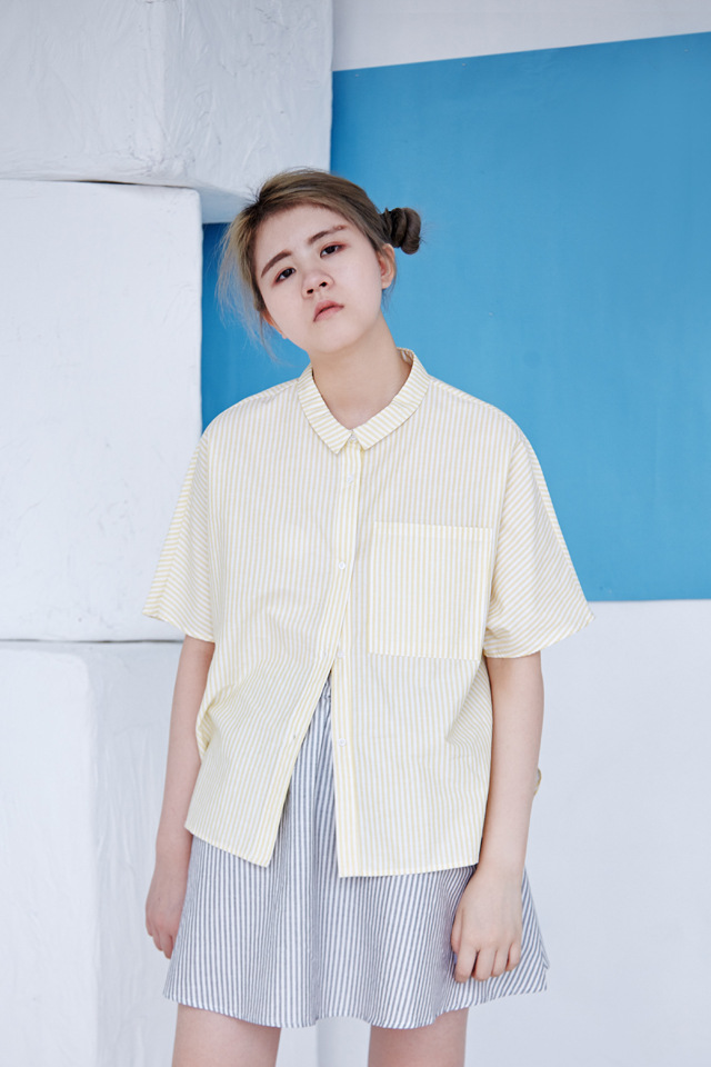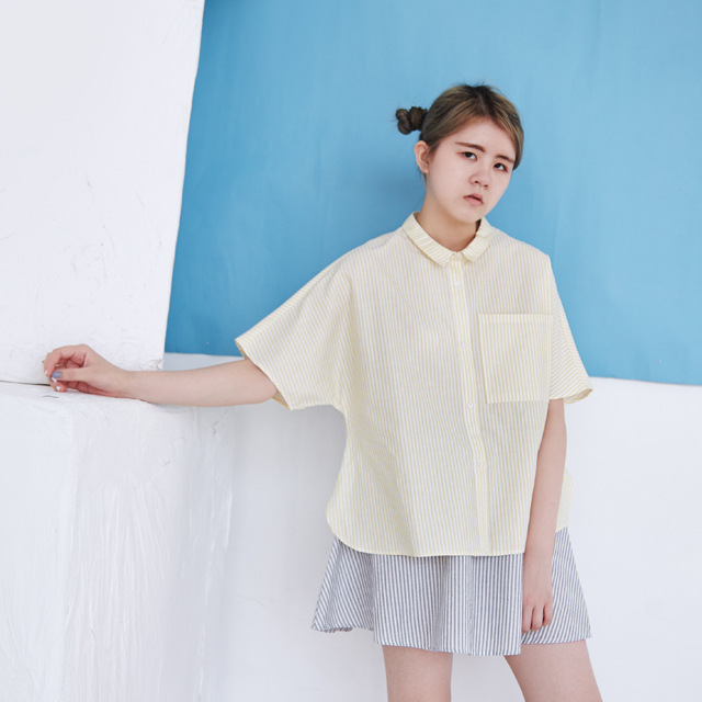 雅紫服飾 跳躍黃色細條紋翻領短袖襯衫女夏2016新款簡約寬松上衣