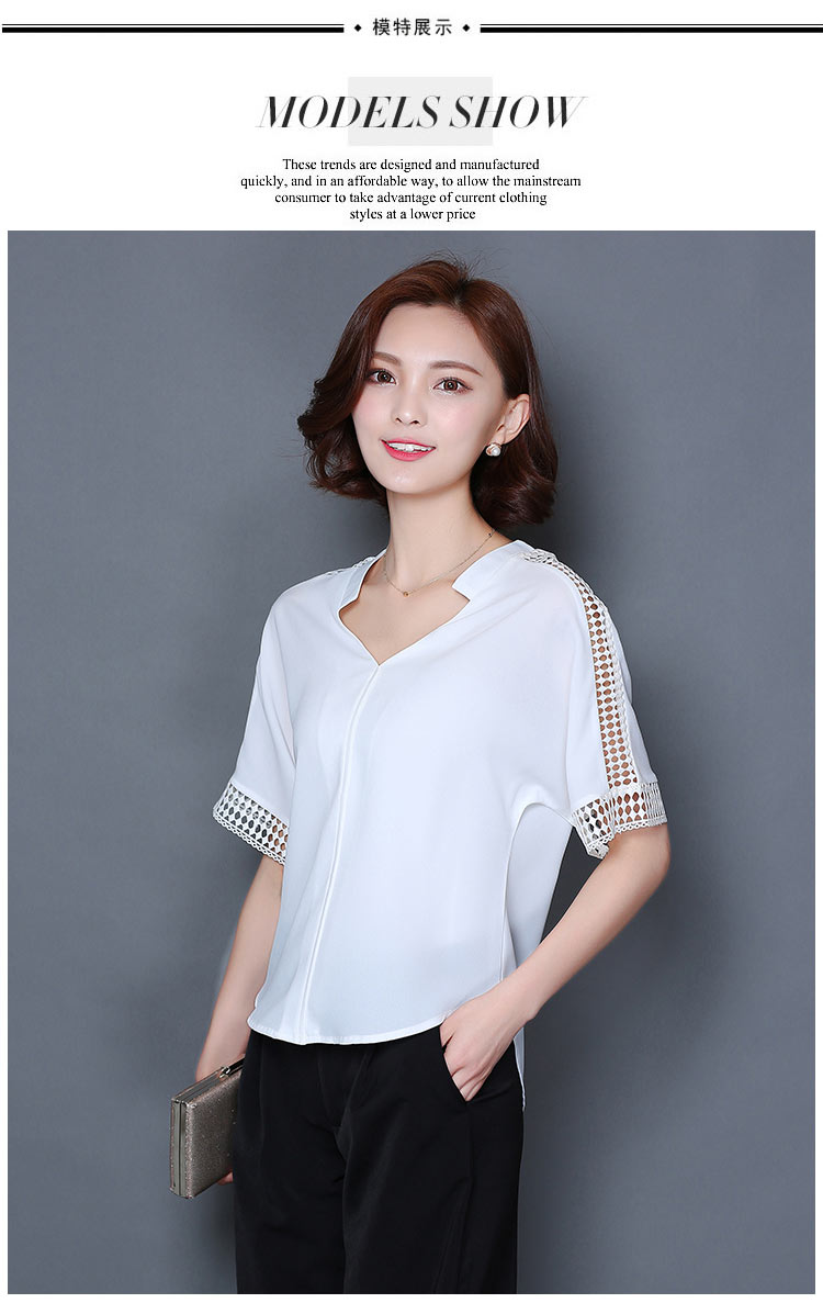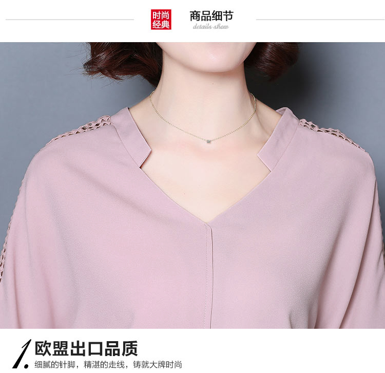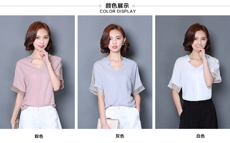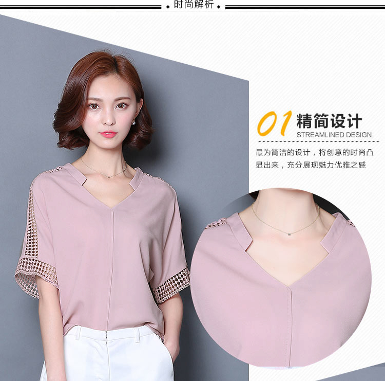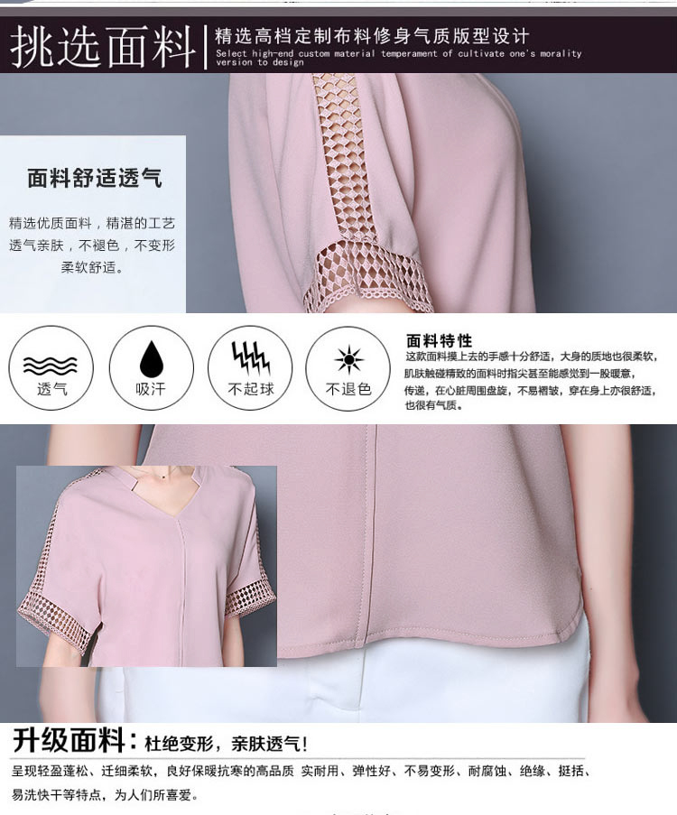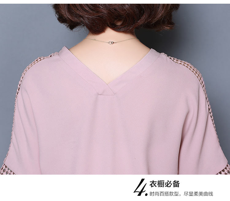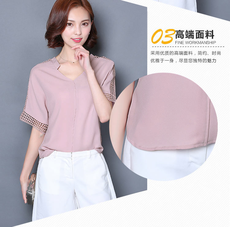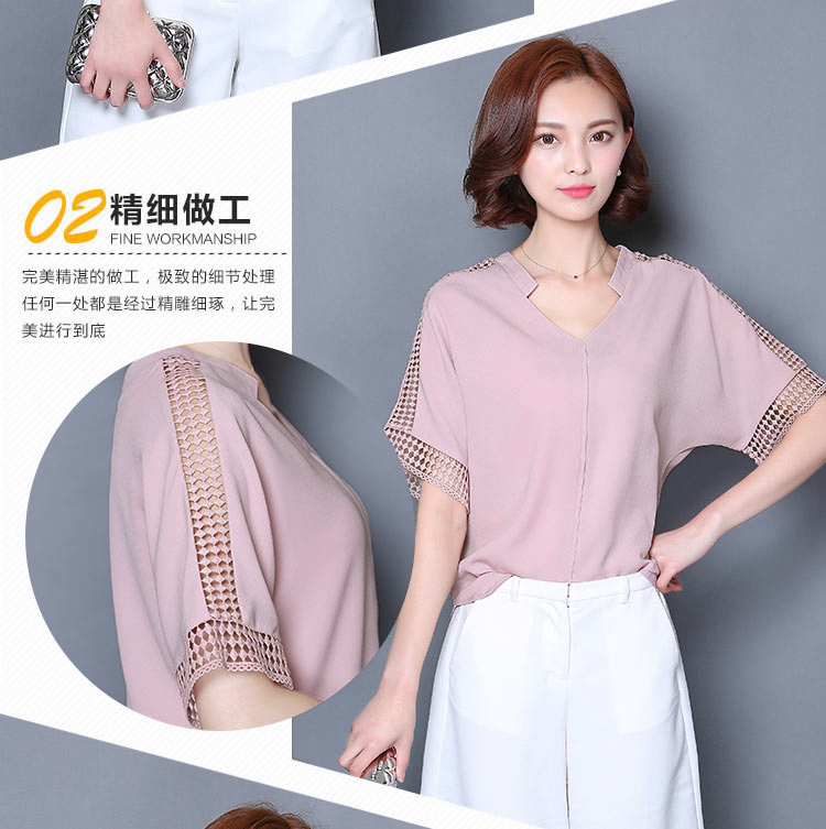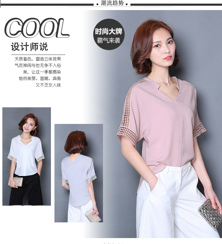 2016夏季新款大碼女士上衣韓版純色寬松顯瘦鏤空短袖V領雪紡衫