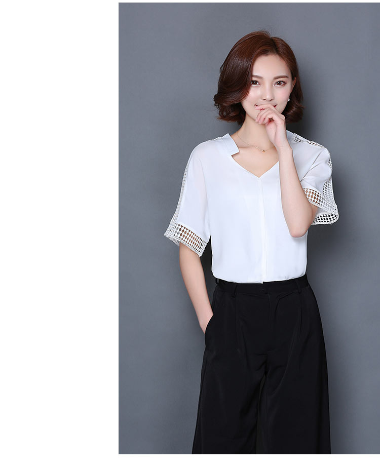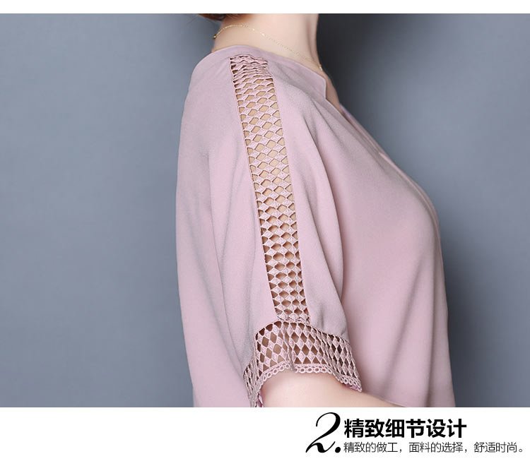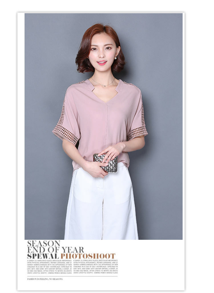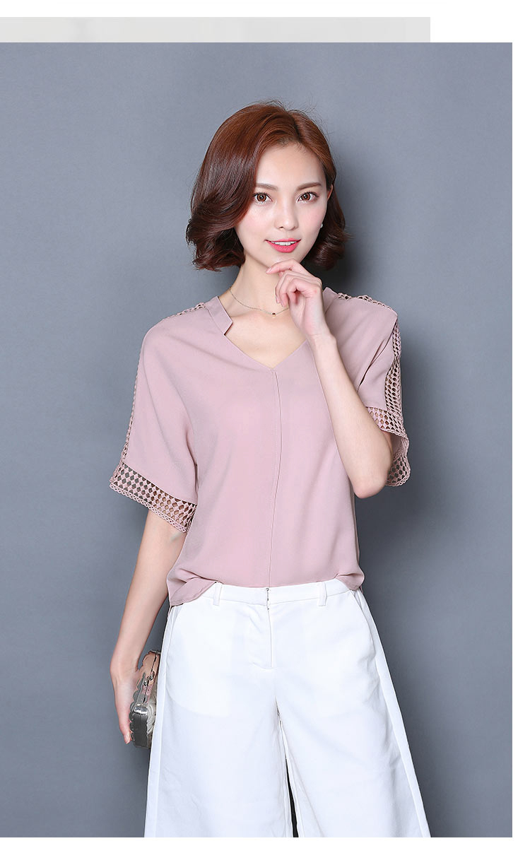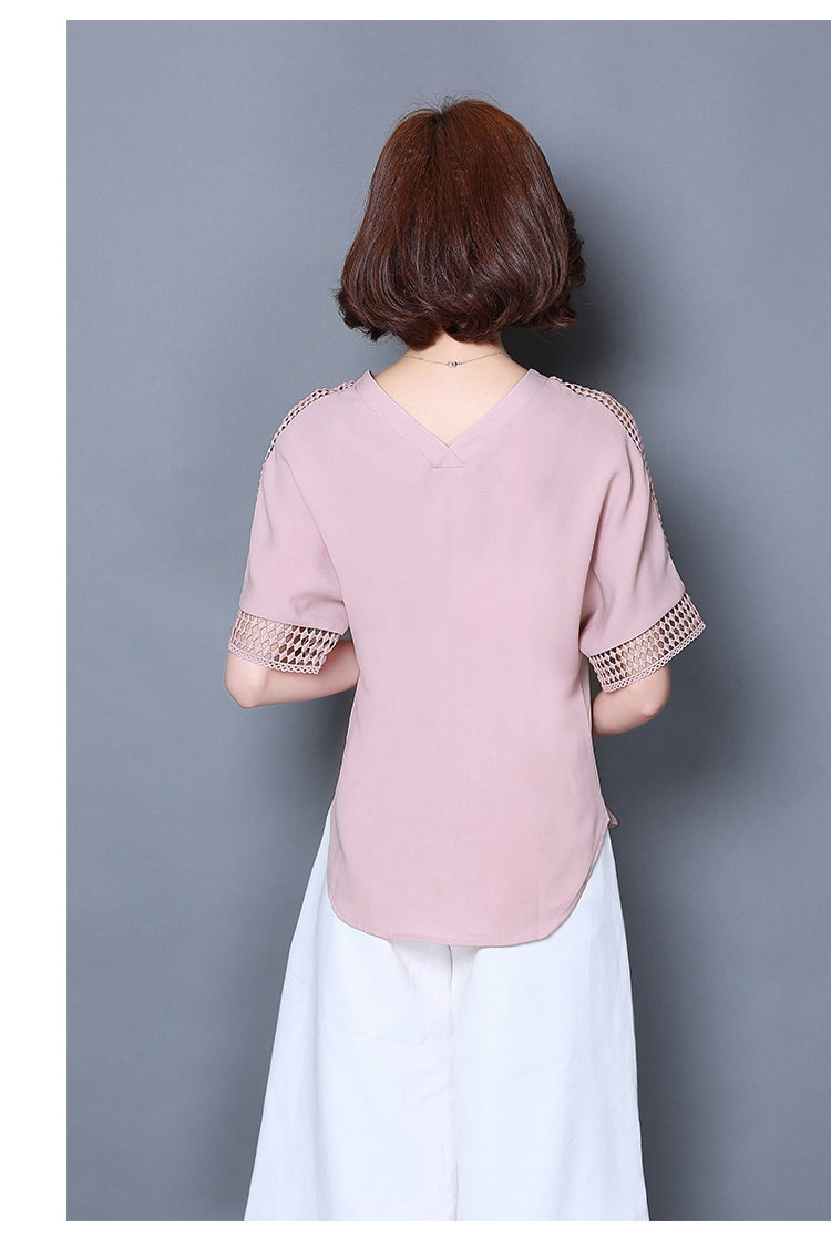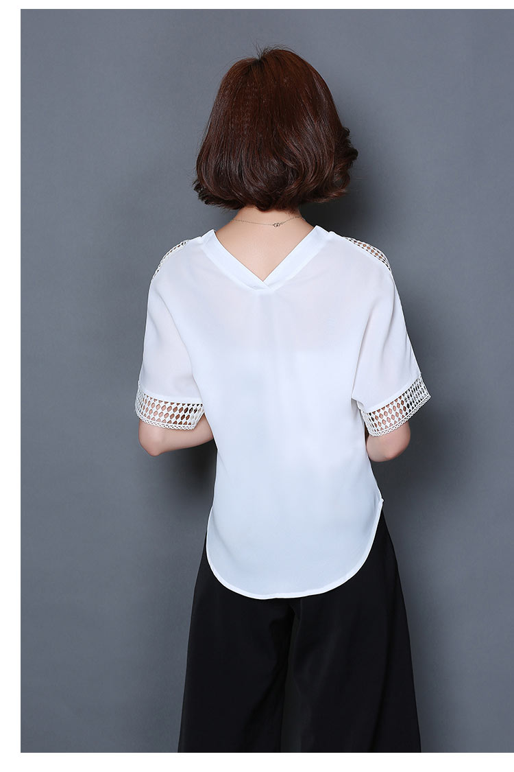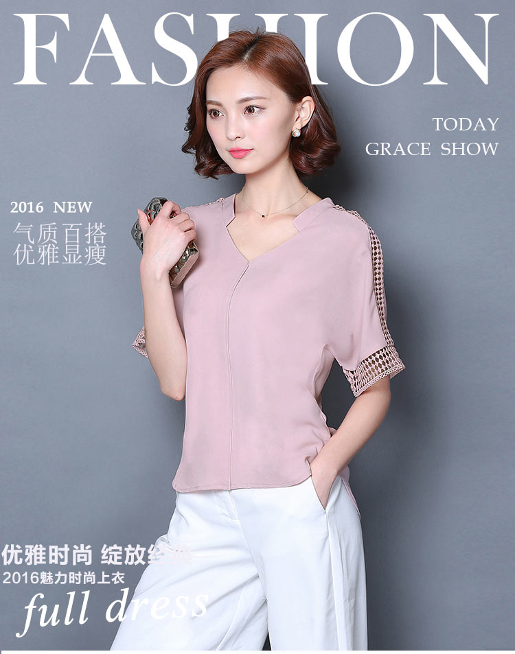 2016夏季新款大碼女士上衣韓版純色寬松顯瘦鏤空短袖V領雪紡衫