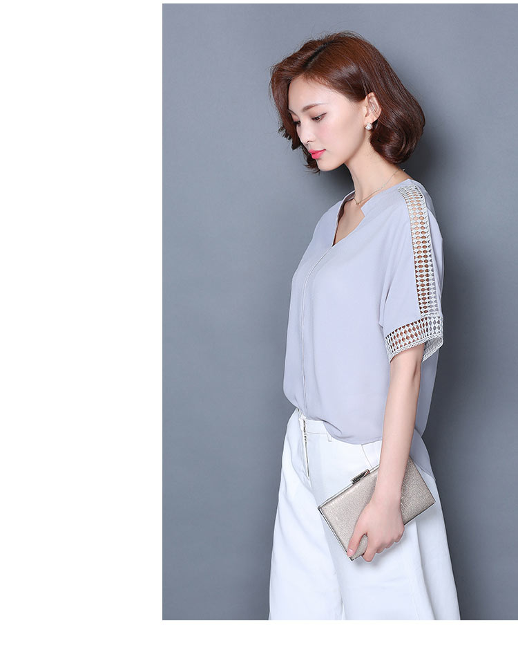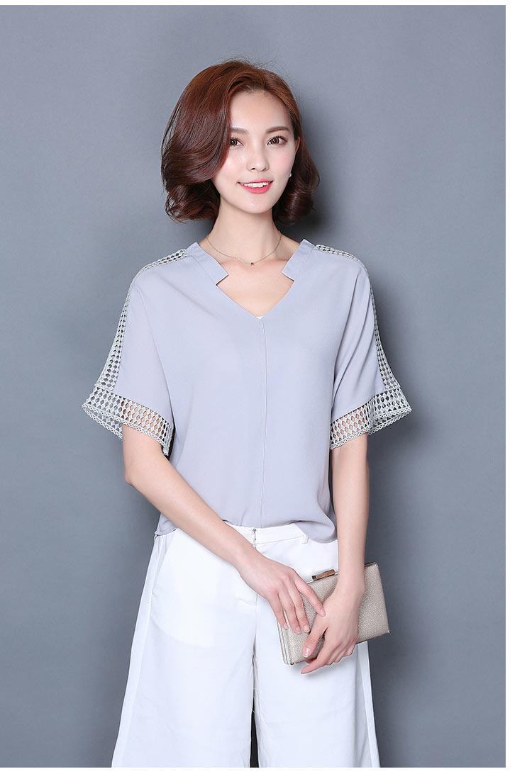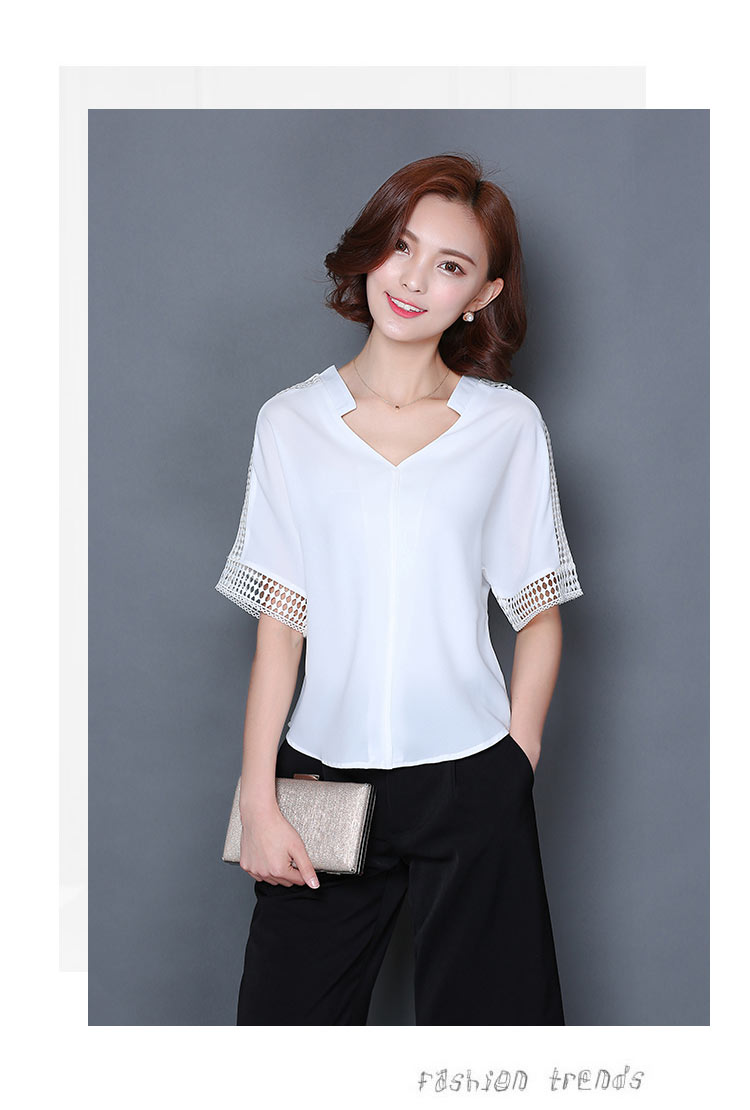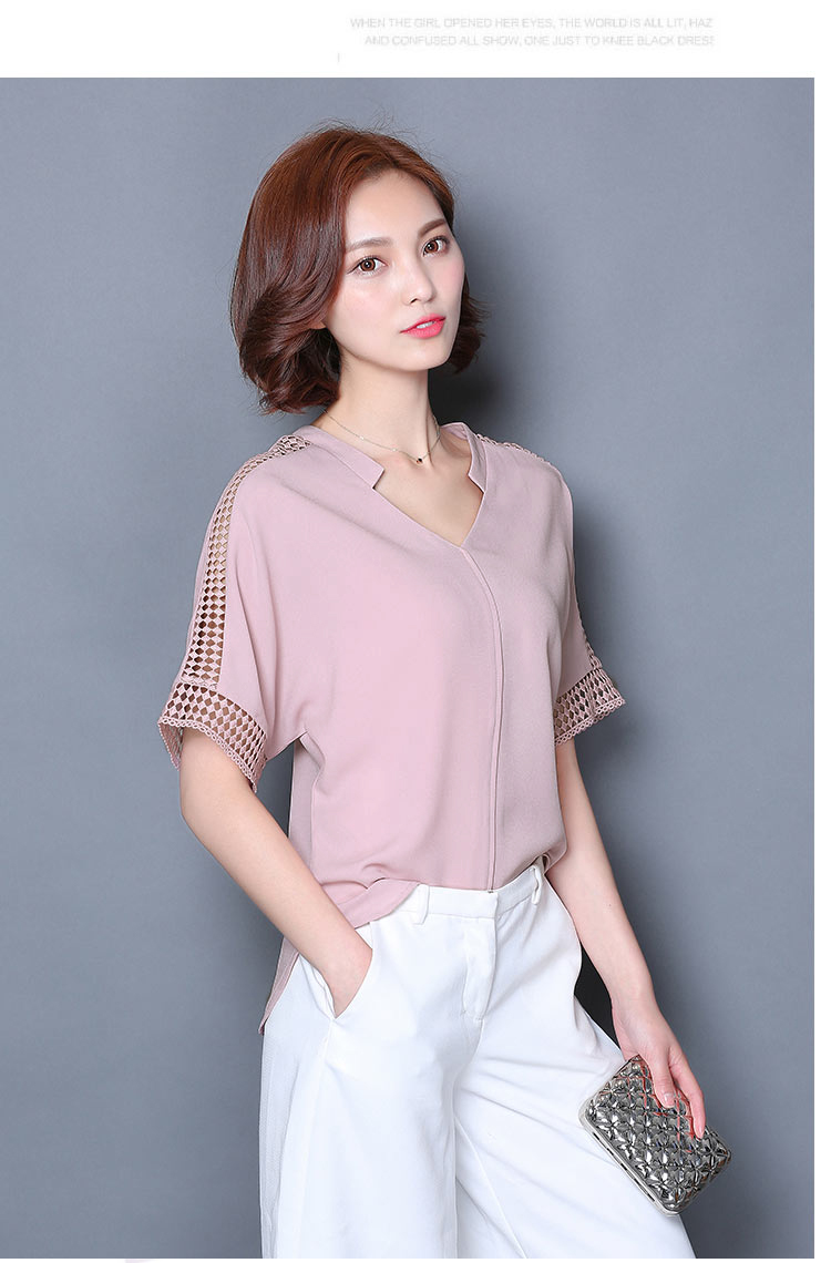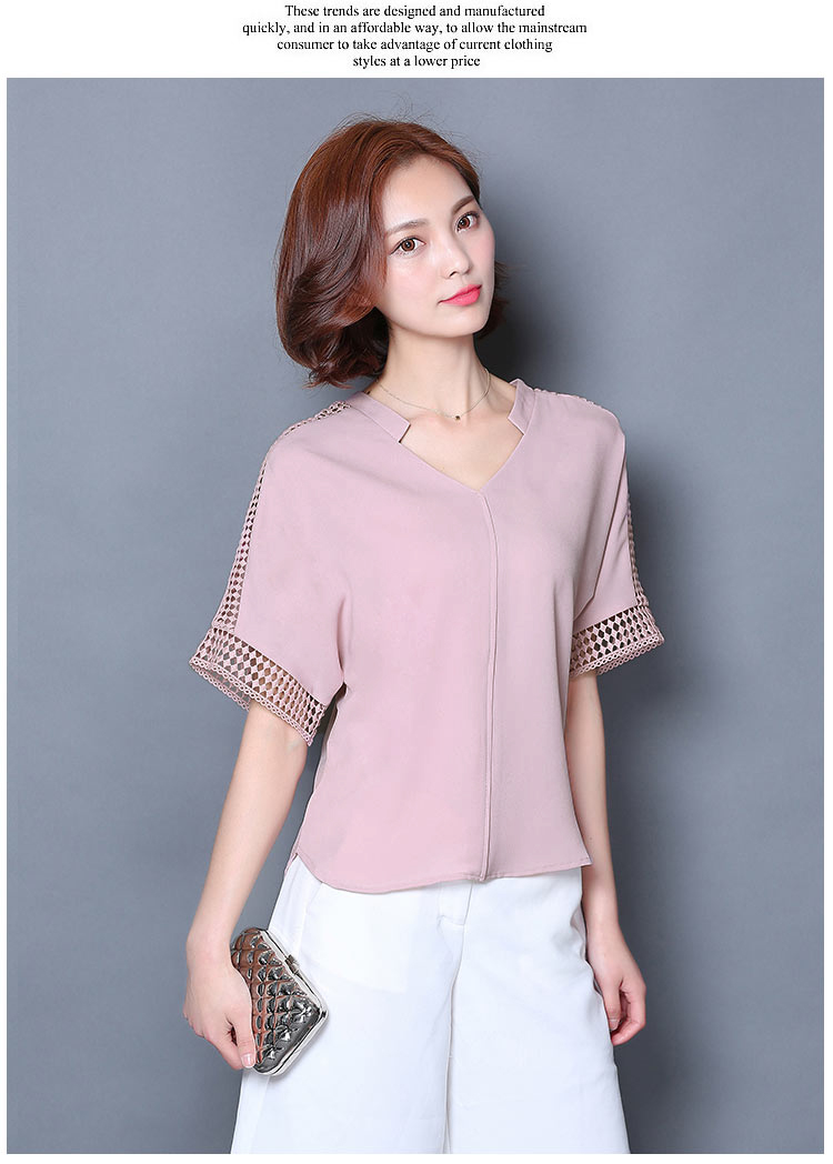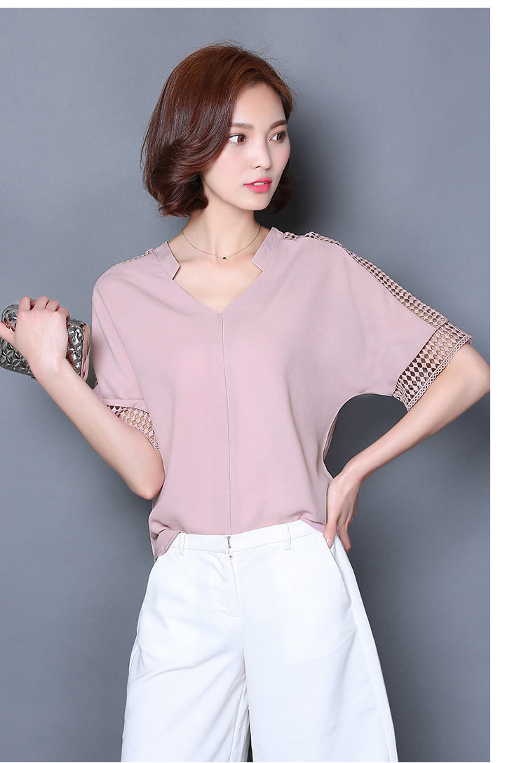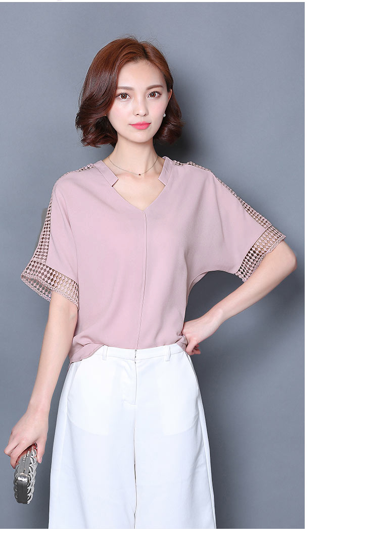 2016夏季新款大碼女士上衣韓版純色寬松顯瘦鏤空短袖V領雪紡衫
