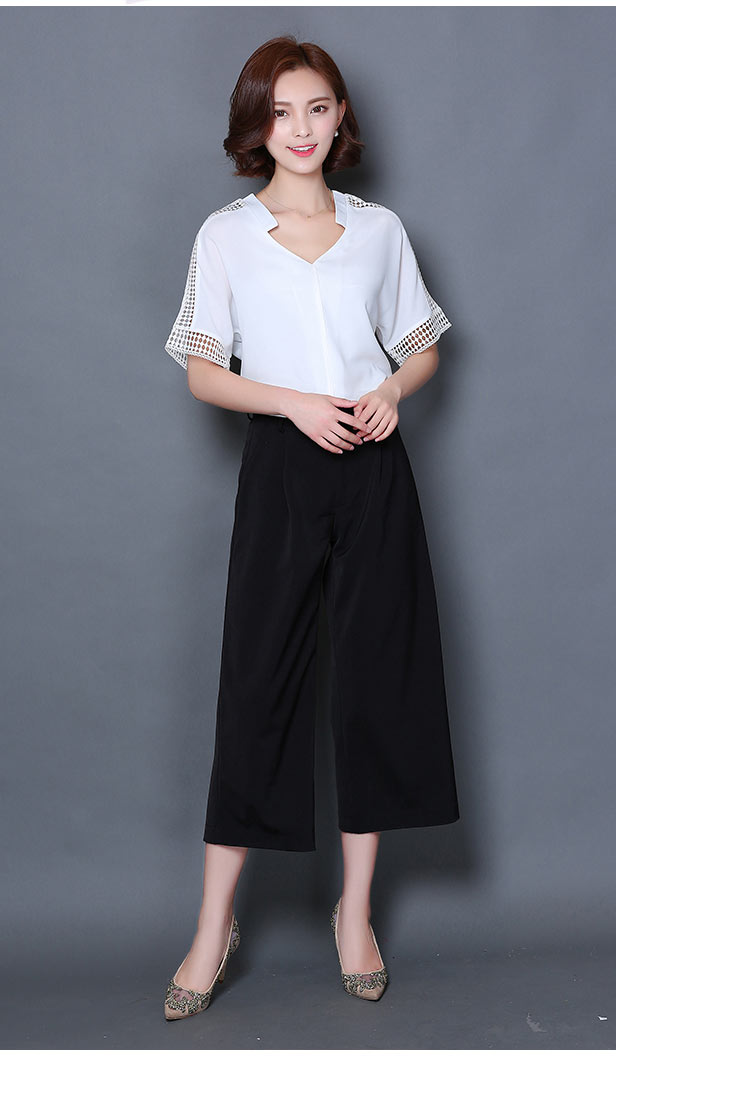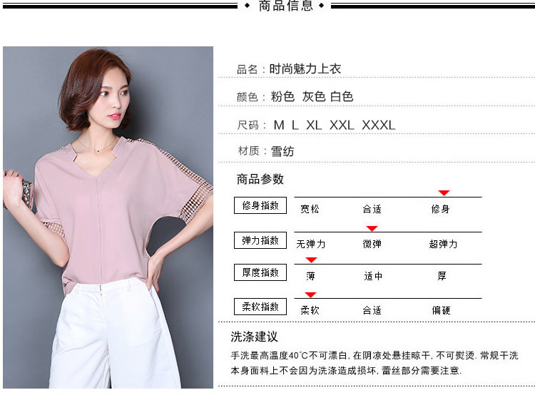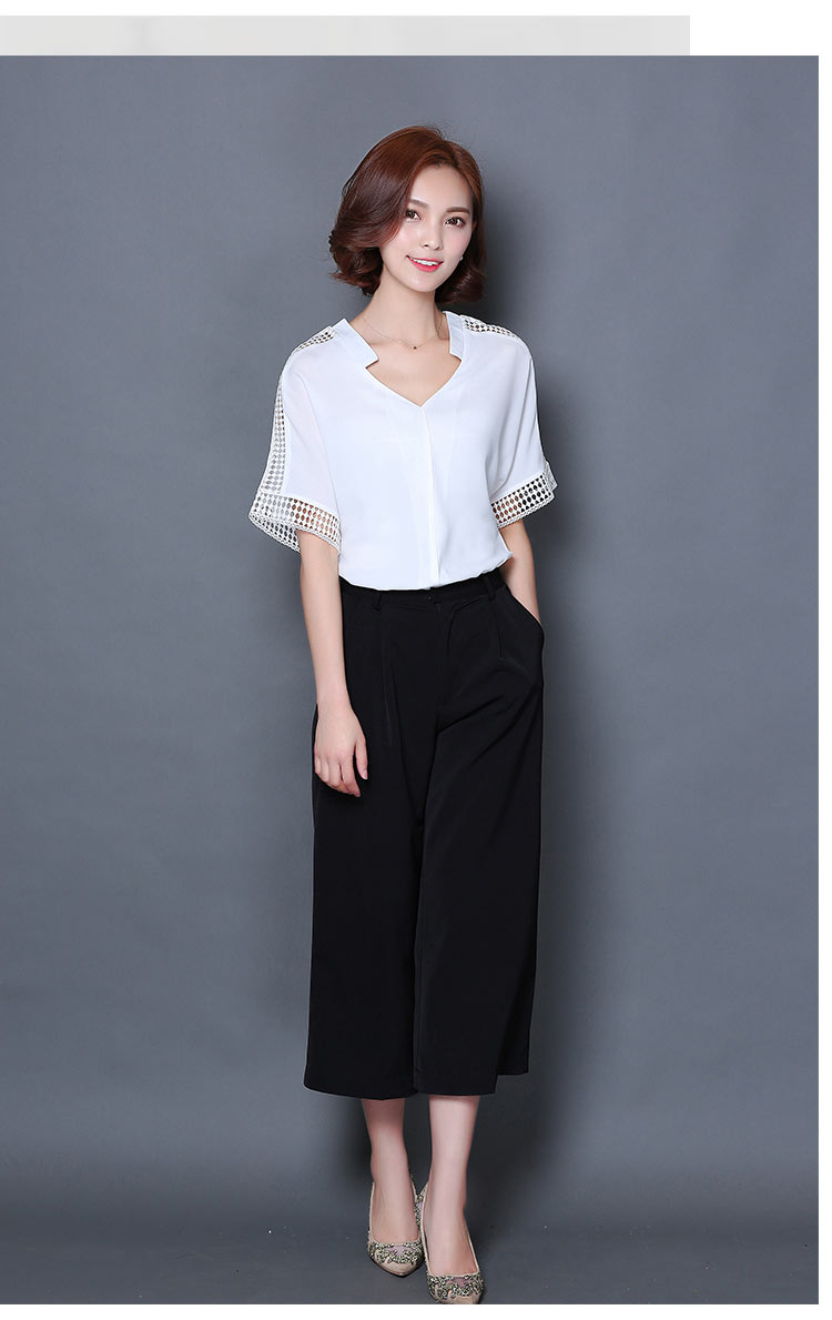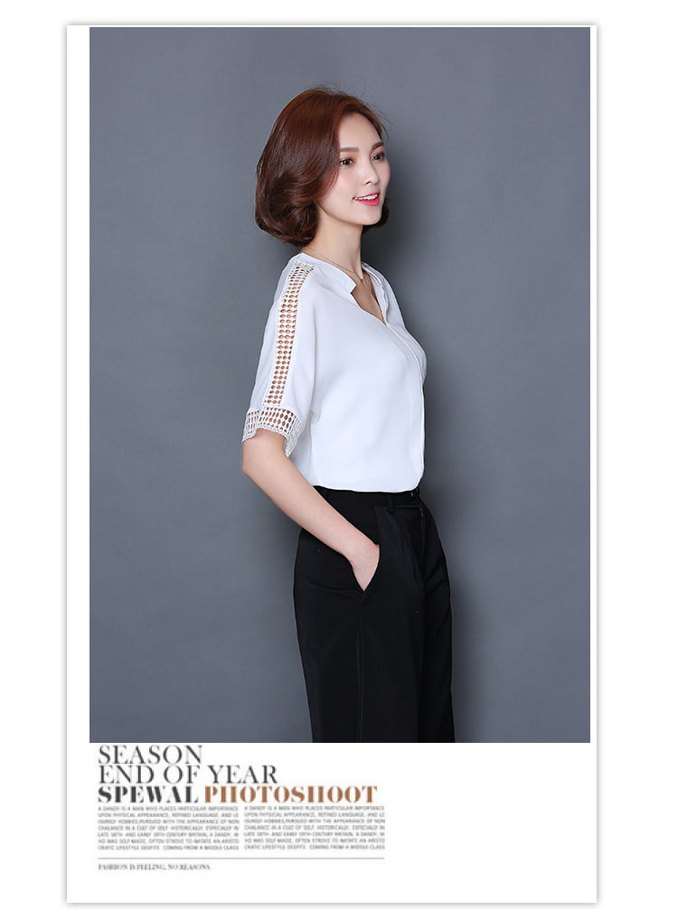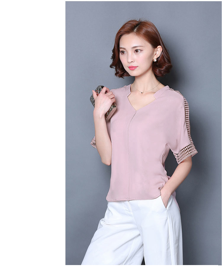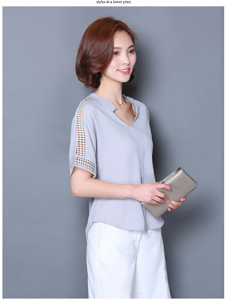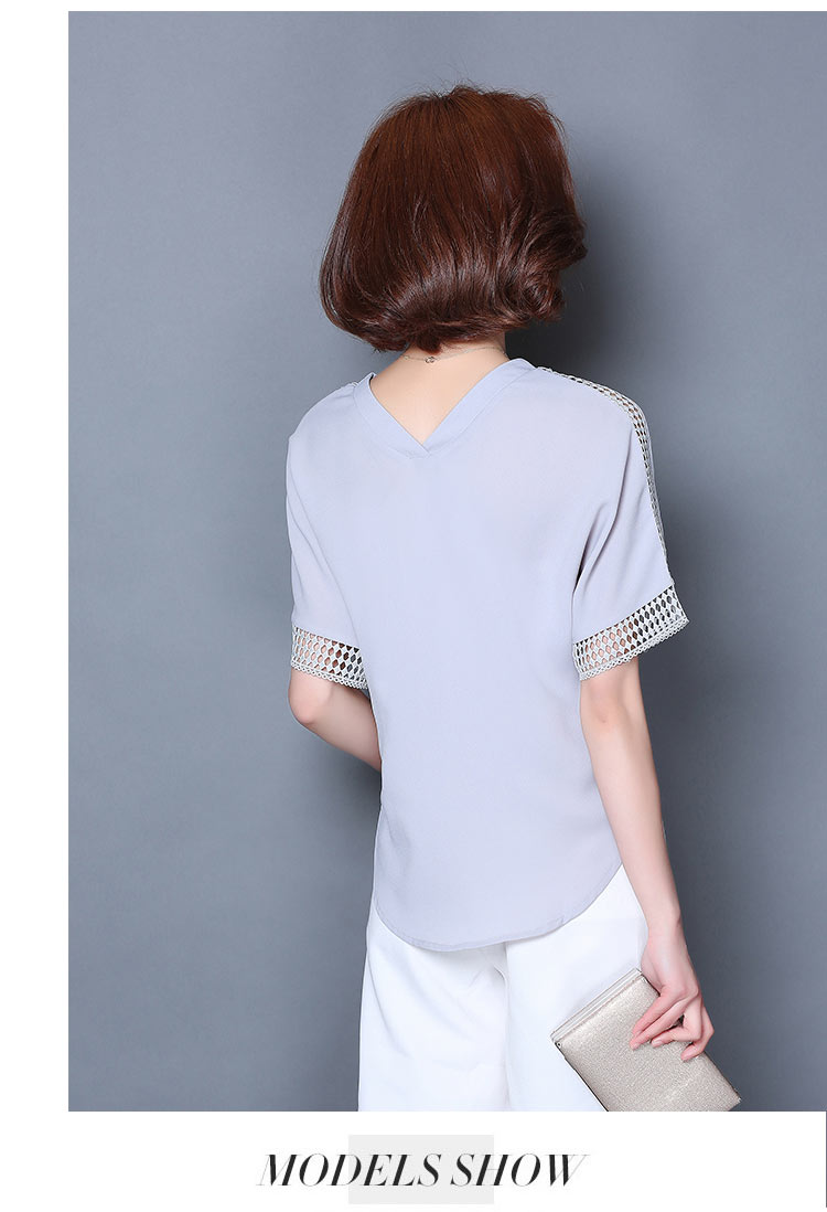2016夏季新款大碼女士上衣韓版純色寬松顯瘦鏤空短袖V領雪紡衫