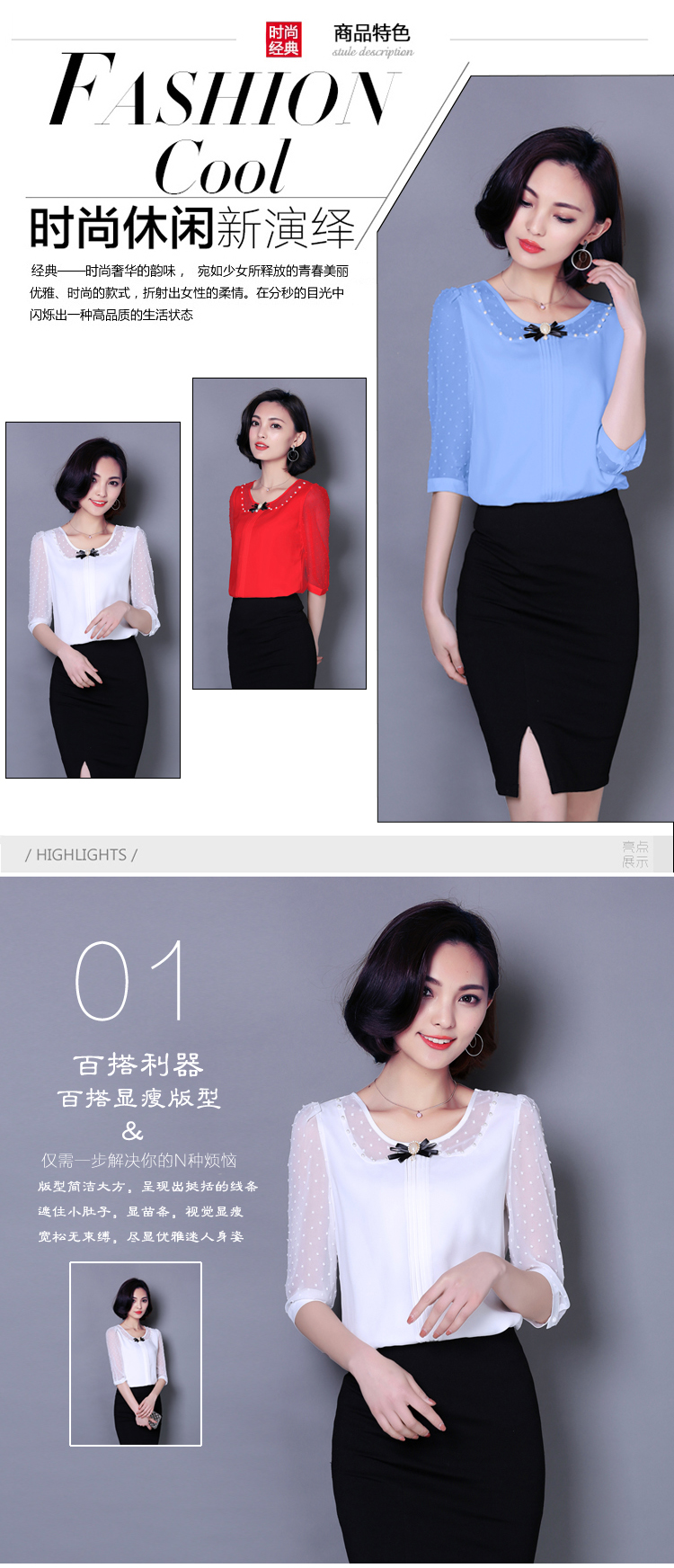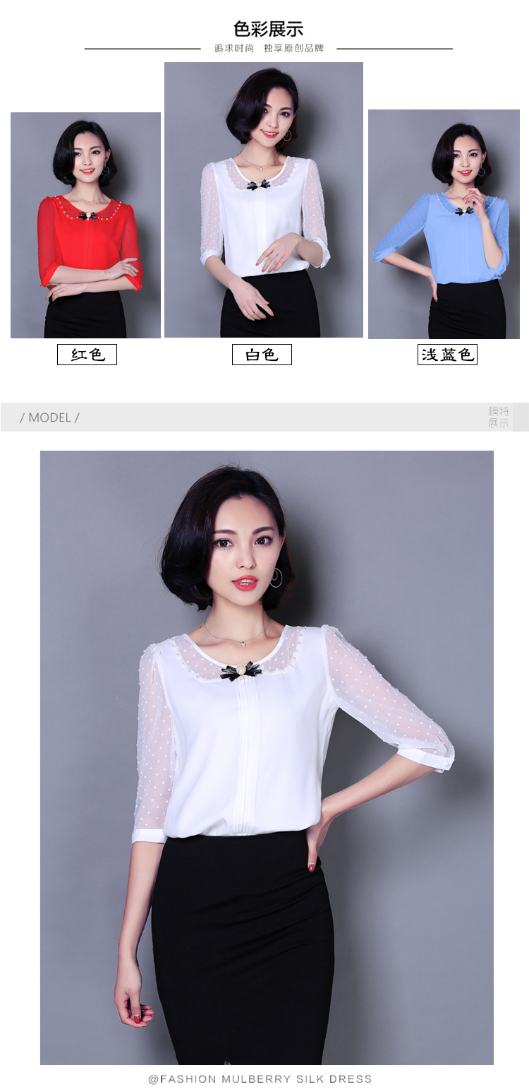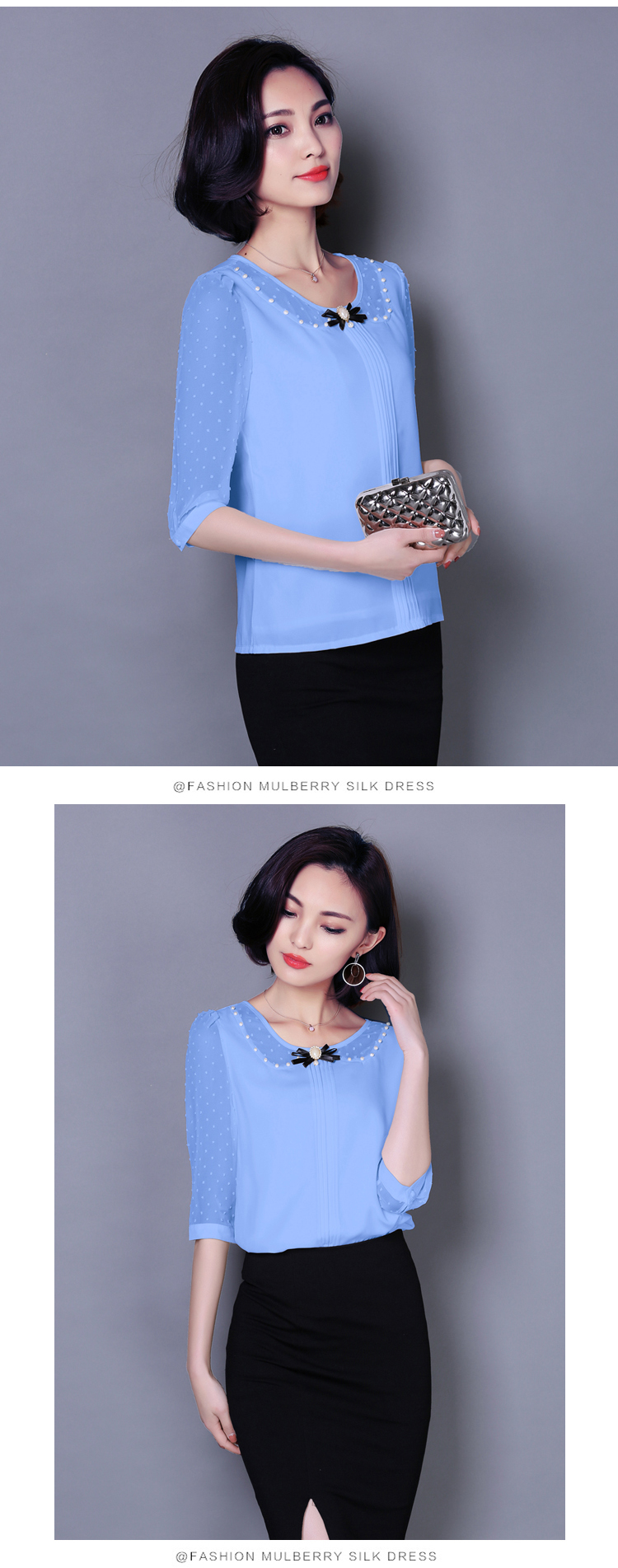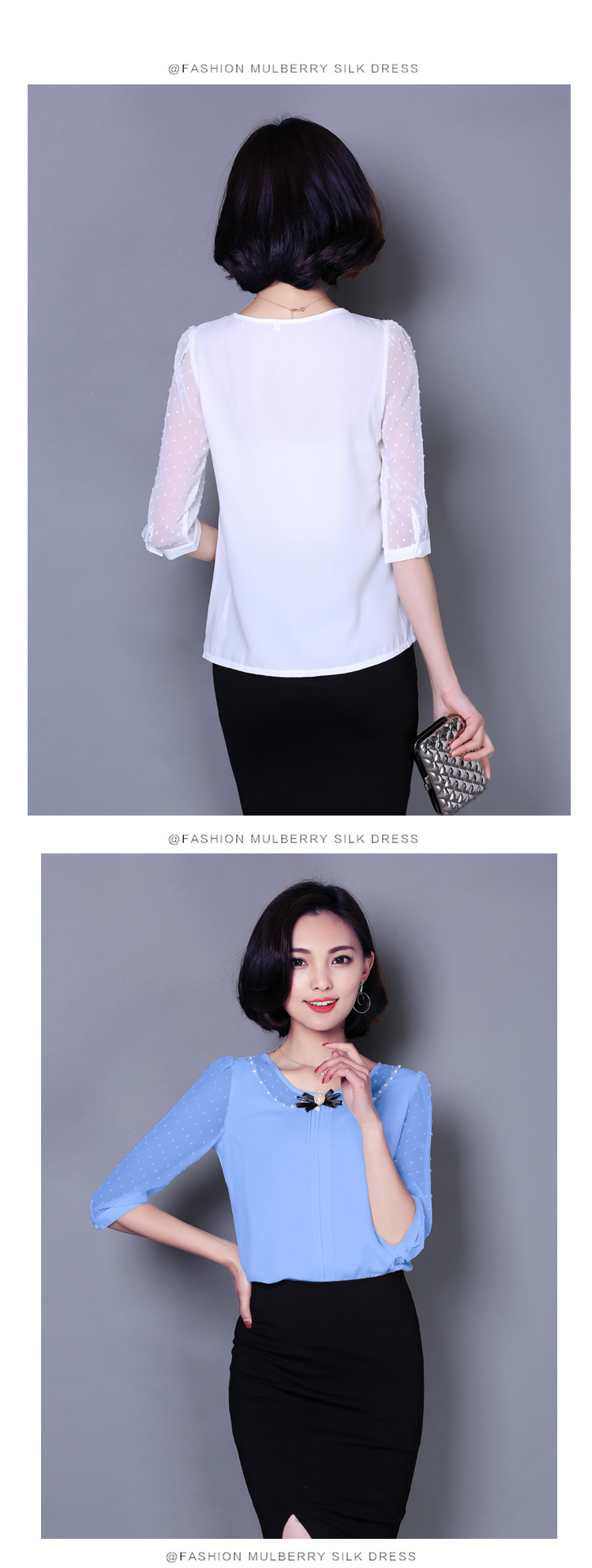 實拍雪紡衫女五分中袖2016春夏新款韓版修身圓領釘珠雪紡小衫上衣