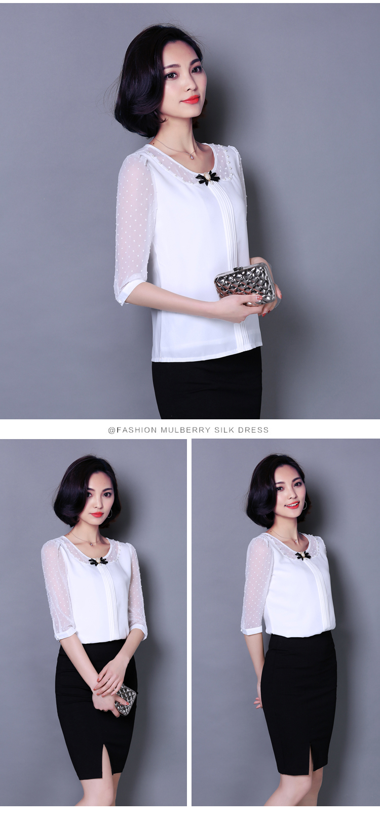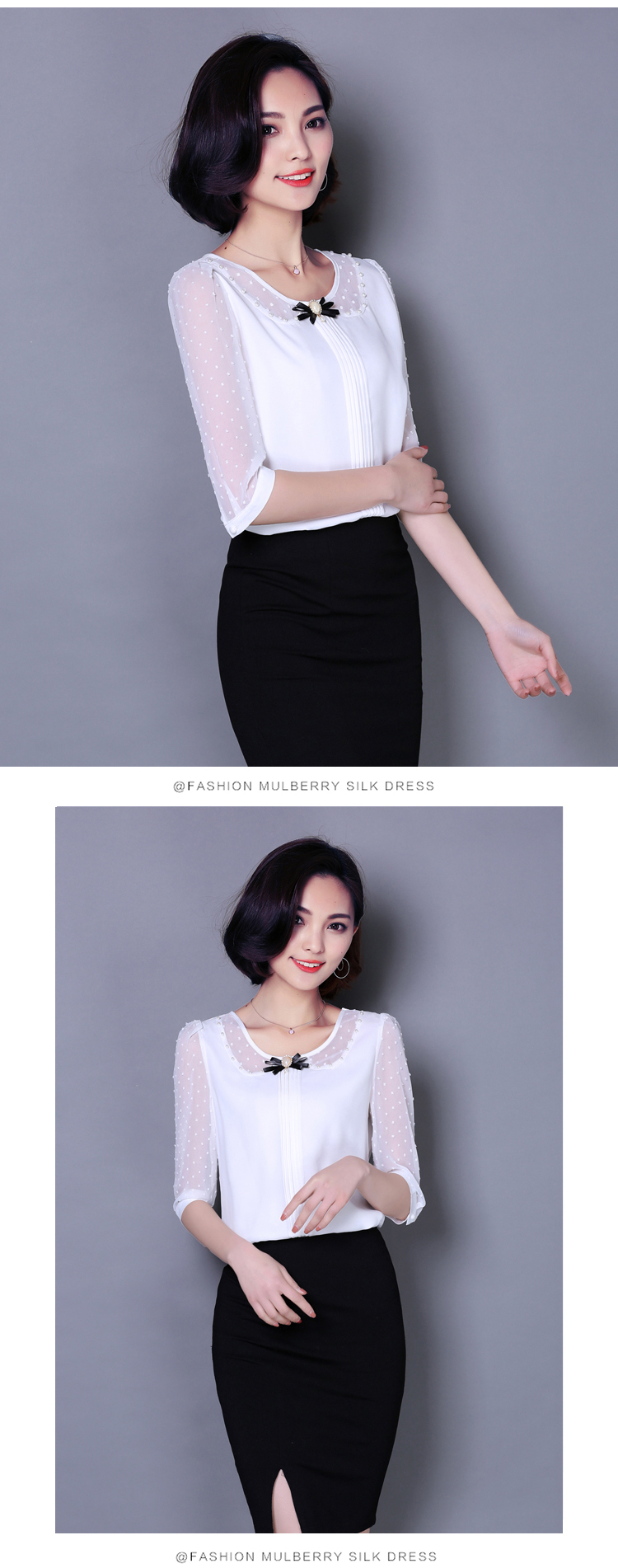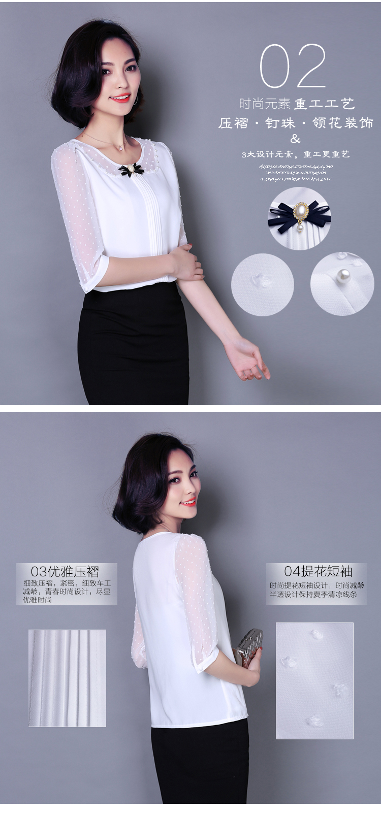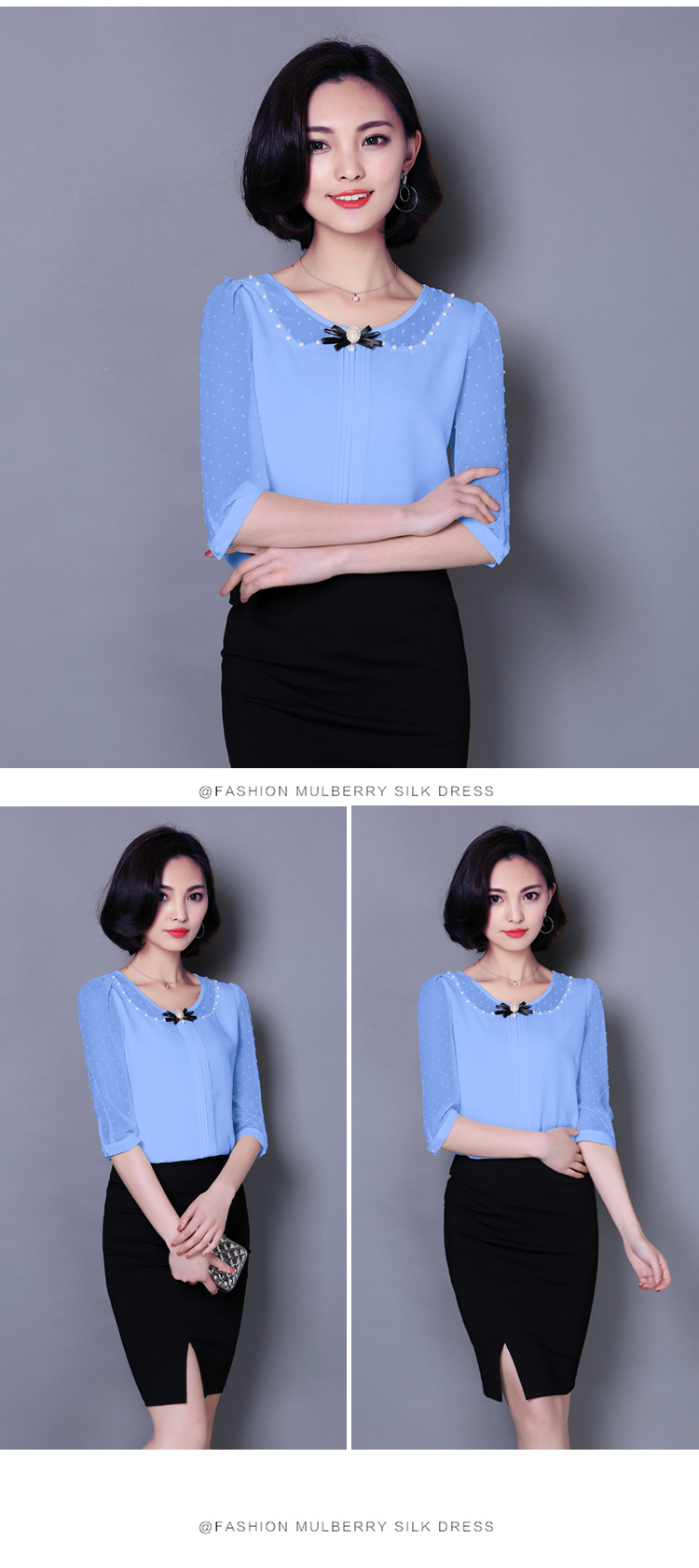 實拍雪紡衫女五分中袖2016春夏新款韓版修身圓領釘珠雪紡小衫上衣