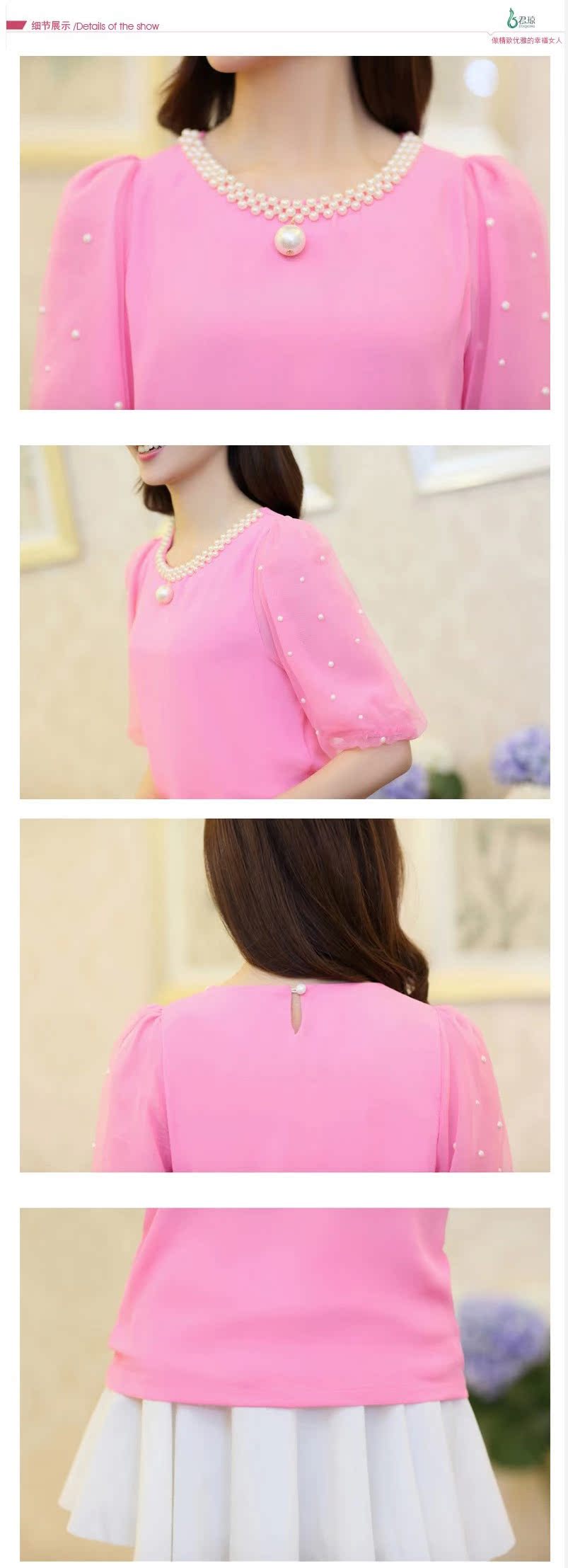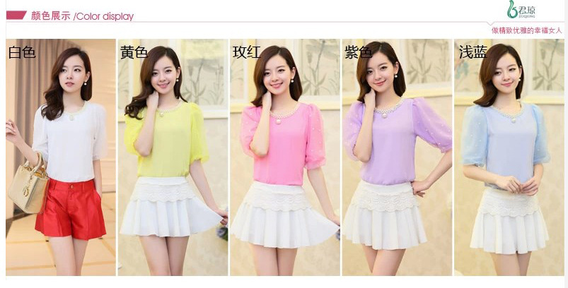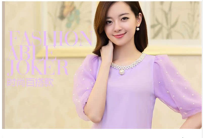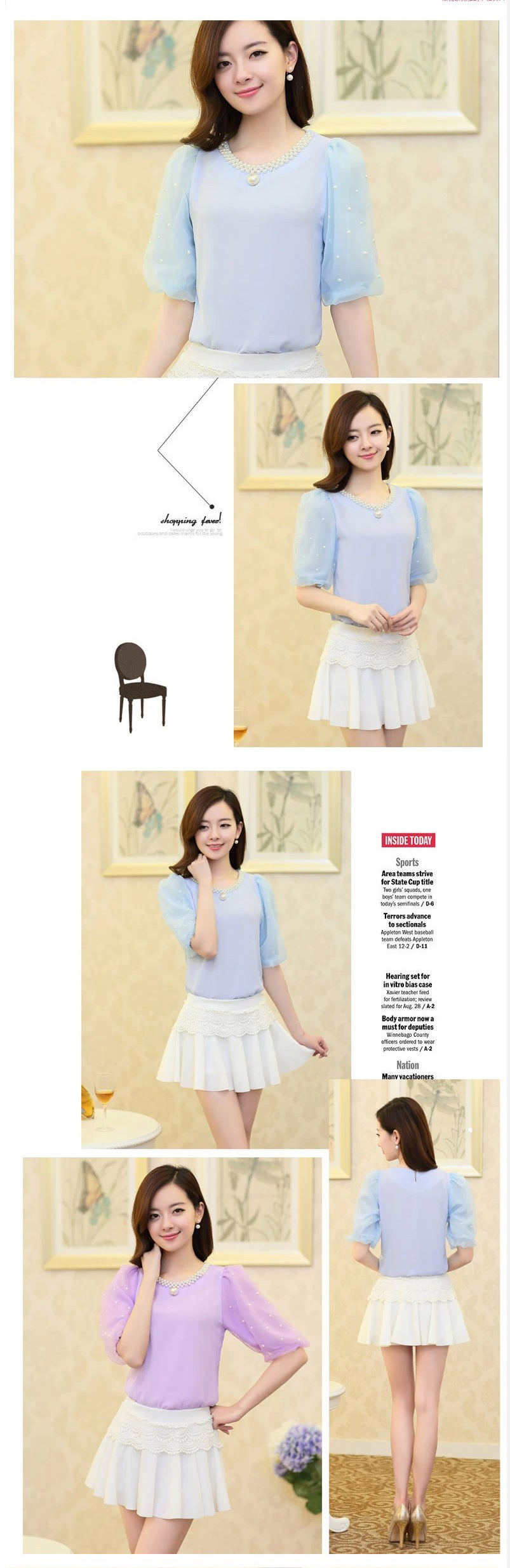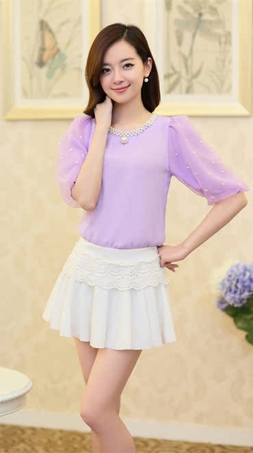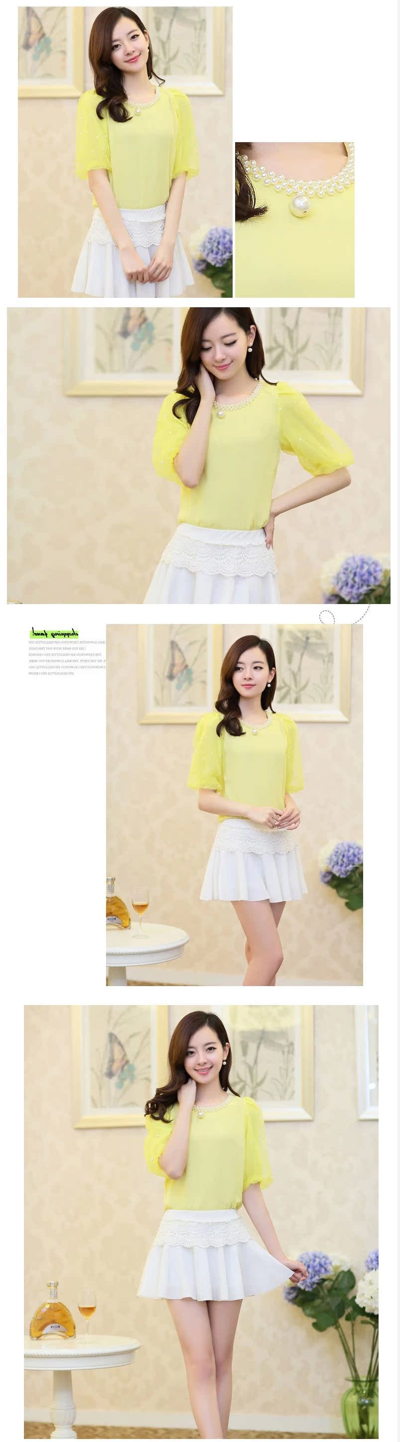 雪紡衫 短袖女2016夏裝新款釘珠短款小衫韓版圓領泡泡袖上衣