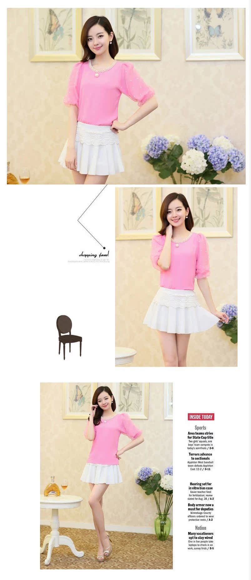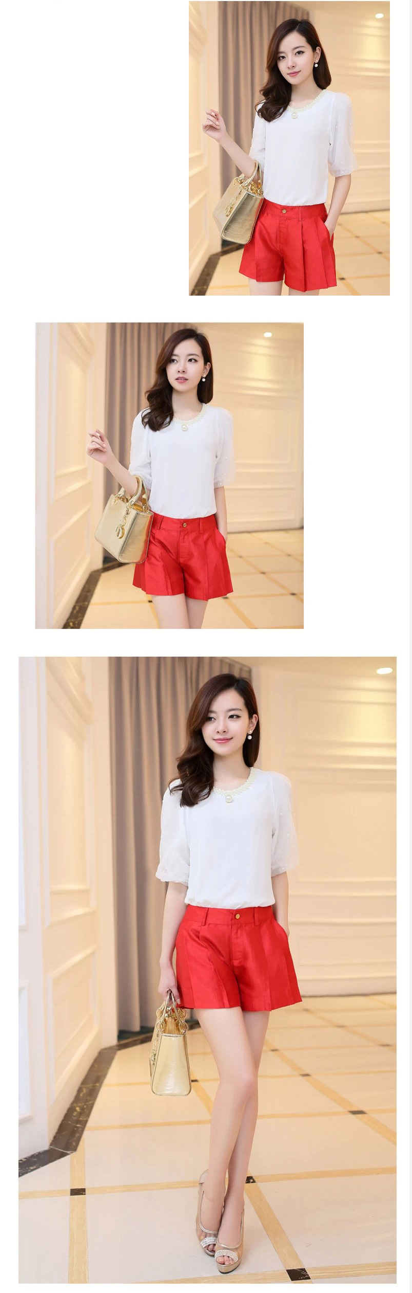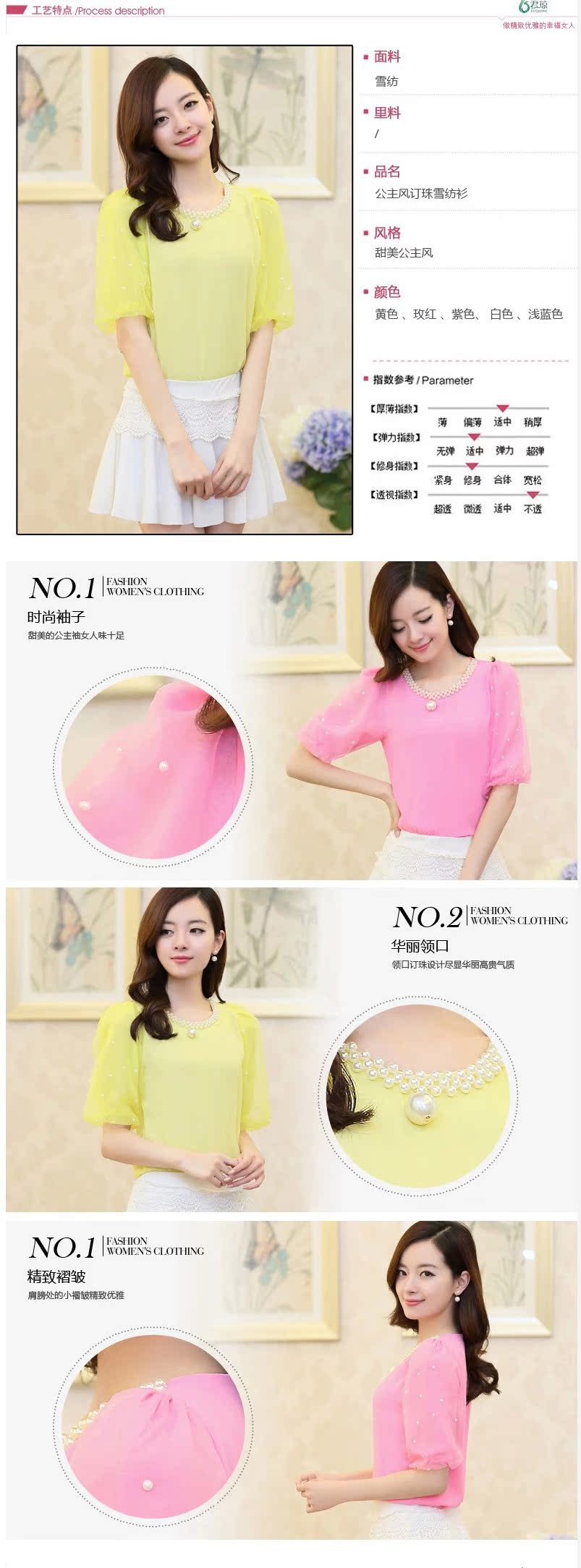 雪紡衫 短袖女2016夏裝新款釘珠短款小衫韓版圓領泡泡袖上衣