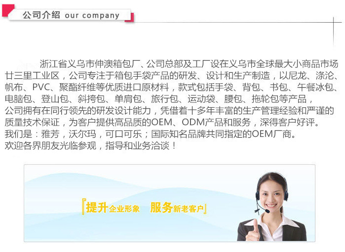 義烏市伸澳箱包廠,位於人傑地靈國際小商品城---義烏,專業生產各種環保箱包,有專業的設計師,打樣師,熟練的技術工人,及優秀的對外貿易團隊;可根據客戶的設計圖,樣品進行打樣報價,也可根據客戶要求設計打樣,品質保證,價格優惠。產品主要有:手提袋,帆佈包,冰包,旅行包,化妝包 等等。產品遠銷美國、歐洲、澳大利亞、南美、東南亞,非洲等市場 。歡迎廣大海內外客商來電來函洽談業務。建立長期互惠互利的貿易合作關系!