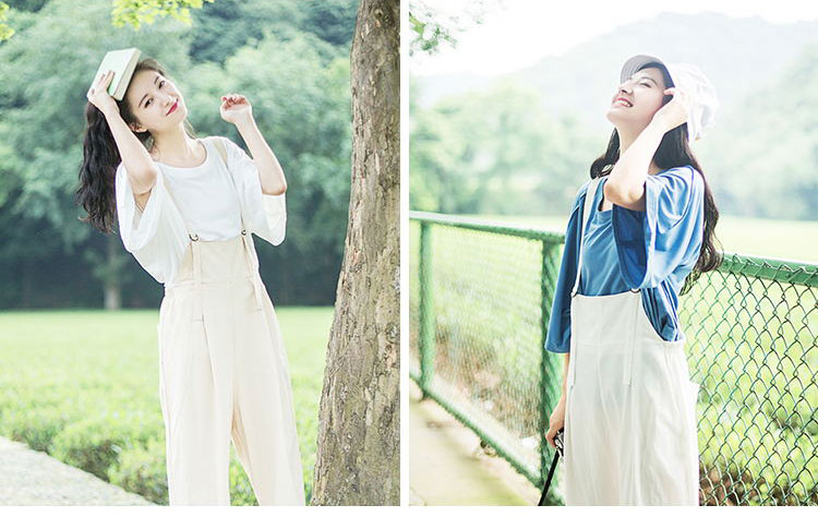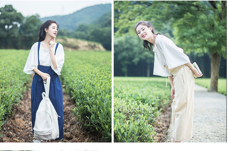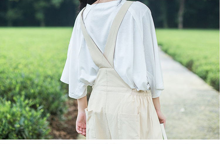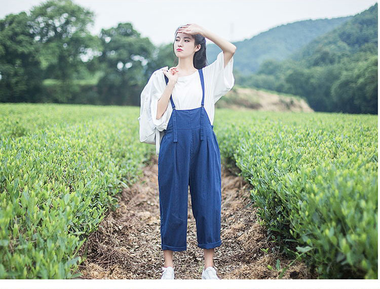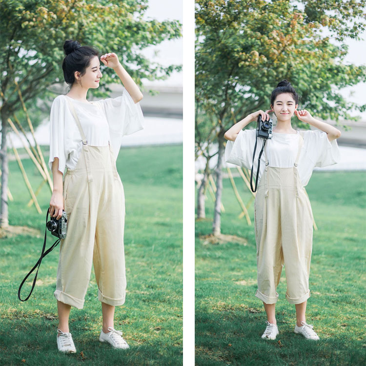 (實拍)敘舊文藝九分背帶褲女寬松 日系簡約純色休閒褲