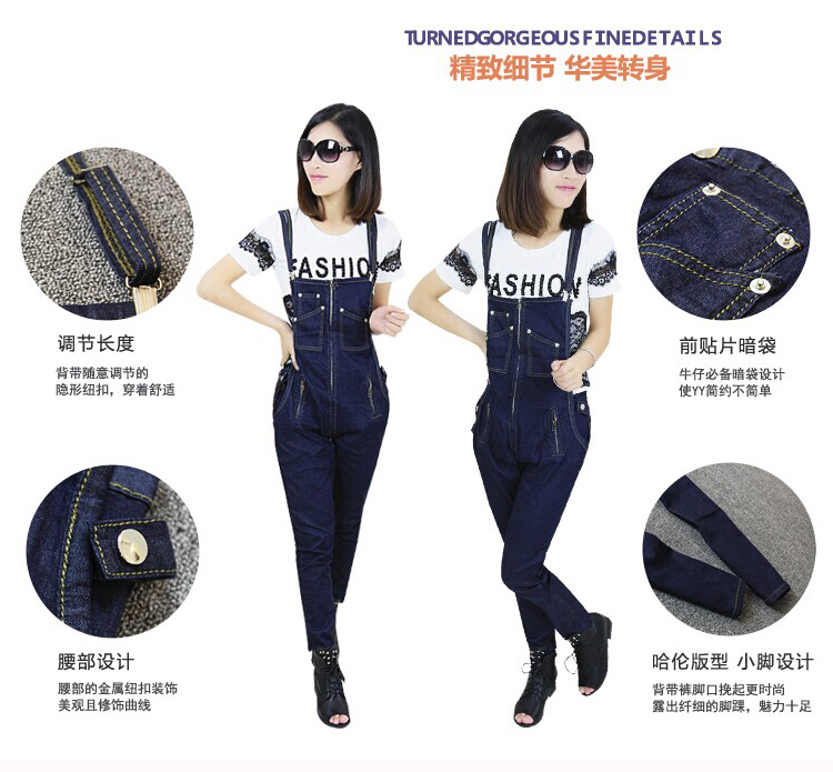 | 工藝特色/Design | 背帶褲一向是時尚達人最愛的一件單品,除瞭能夠拉長身體的線條,讓身姿更顯高挑,還能體現出MM們活潑熱情的風格,減齡的功效更是不在話下。最吸引眼球的是背帶褲上精致的口袋,高調的金屬光澤,演繹不落俗套的流行風格。胸前拉鏈門襟,穿著更加方便美觀。簡約乾凈的立體剪裁,小腳,不挑腿型還能夠巧妙地修飾腿型,輕松勾勒出女性纖瘦婀娜的身材,褲管輕挽,潮流隨性的feel更顯出挑。足夠寬松、足夠舒適,就像鄰傢女孩一樣讓人覺得靜謐安好。時尚休閒風格應有盡有。搭配上輕便的帆佈鞋,就是迷人小清新。 | |