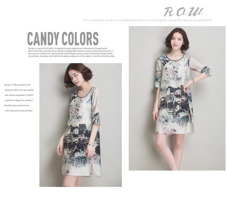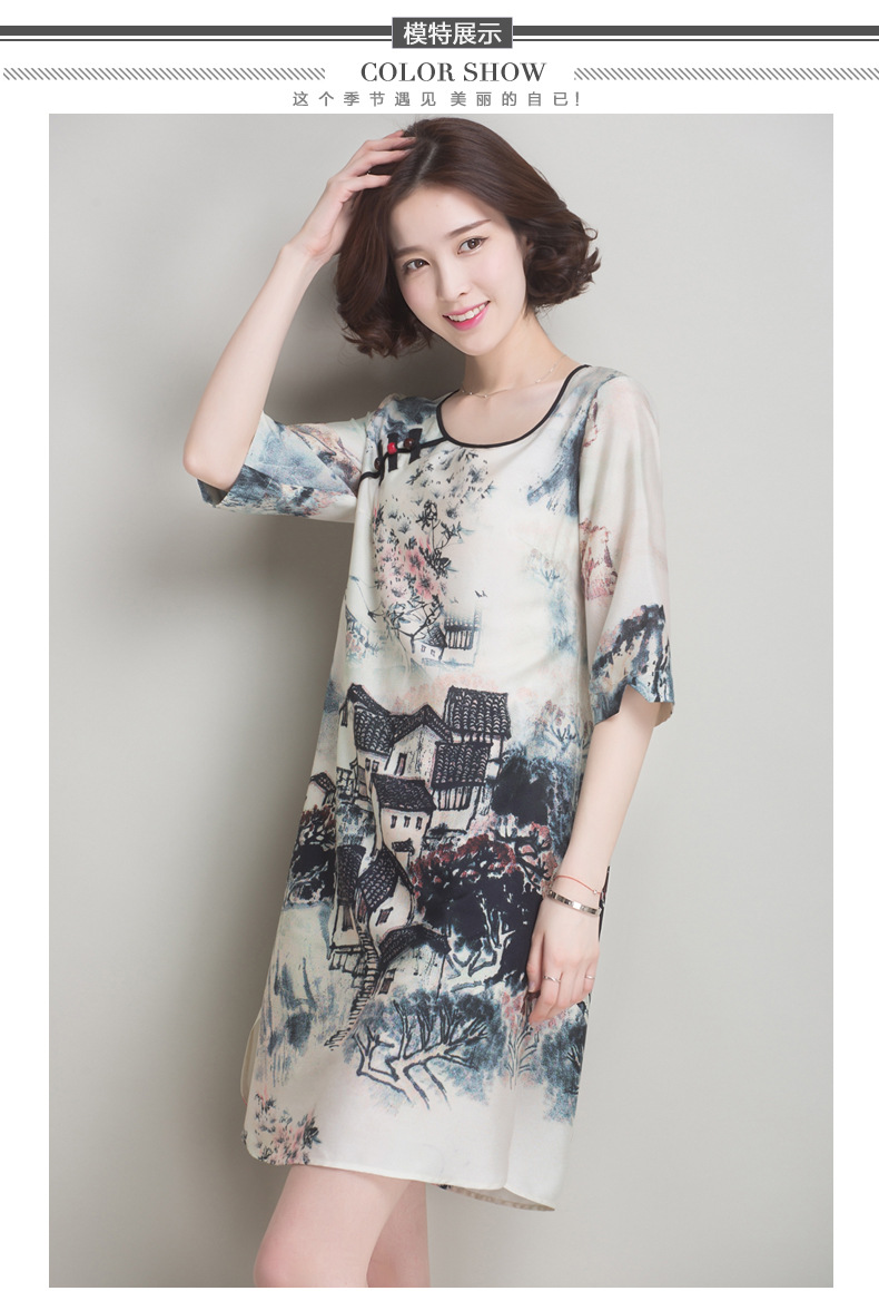 夏新款復古山水畫水墨印花雪紡女裝中長款連衣裙文藝寬松盤扣旗袍