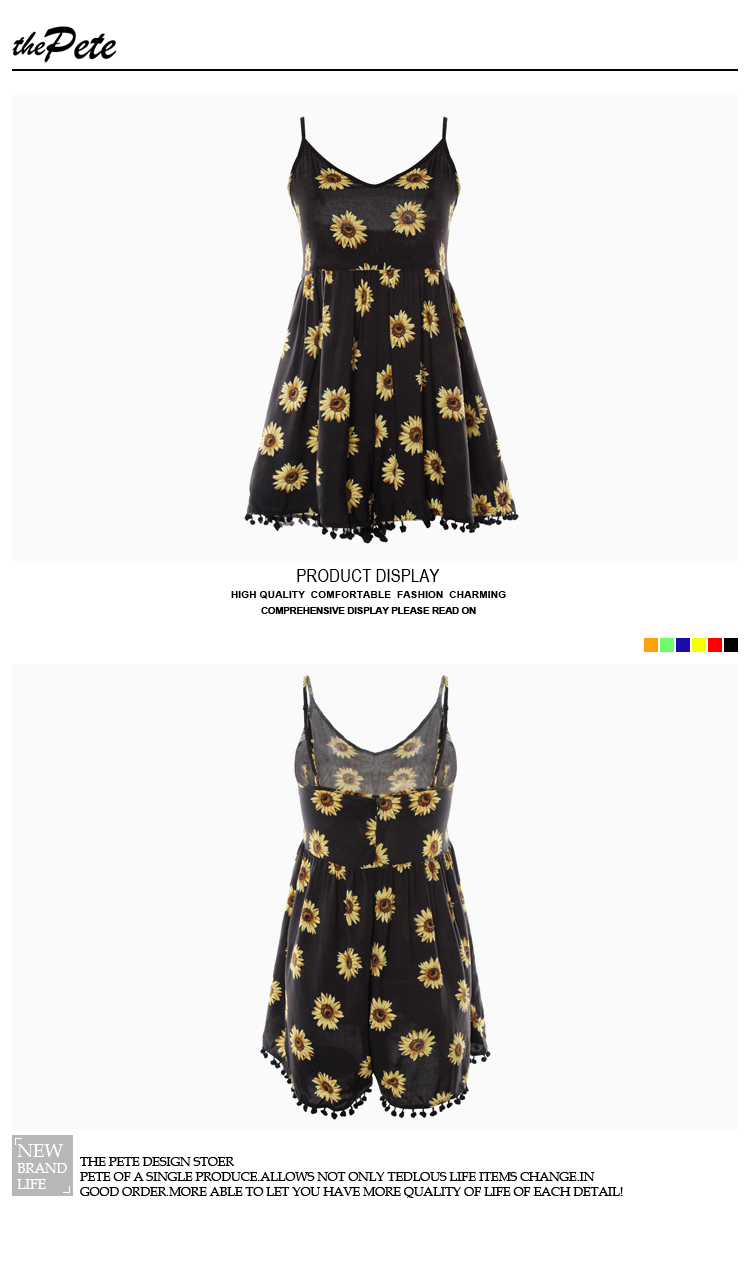 歐美潮流夏季新款吊帶性感收腰花邊設計向日葵印花連身短褲