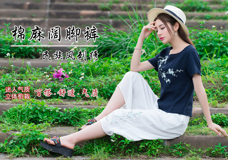 棉麻闊腳褲民族風漫溪雨新款休閒寬松梅花刺繡九分褲 M.40
