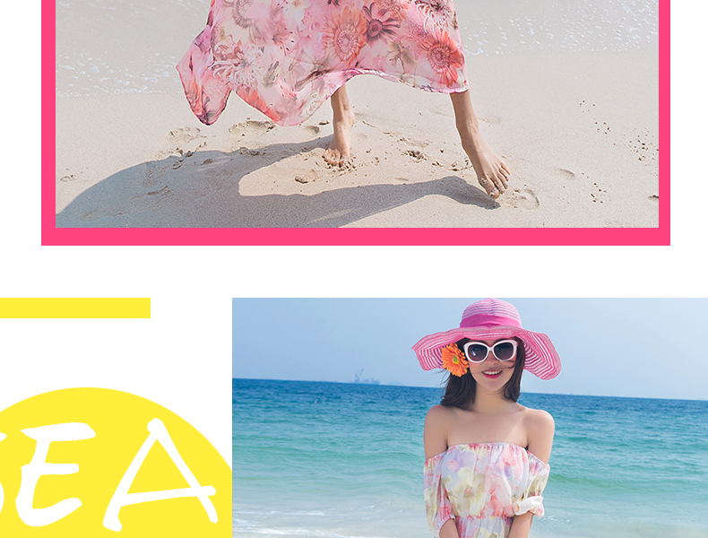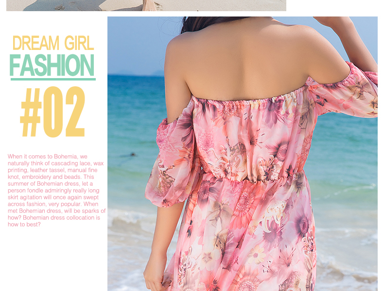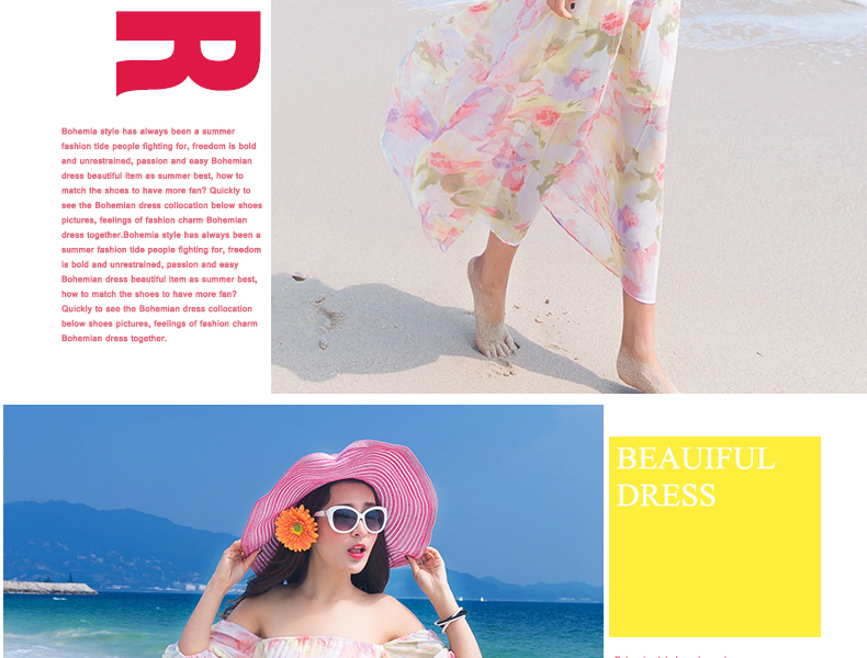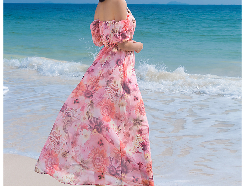 夏波西米亞一字領印花露肩收腰沙灘長裙海邊度假連衣裙