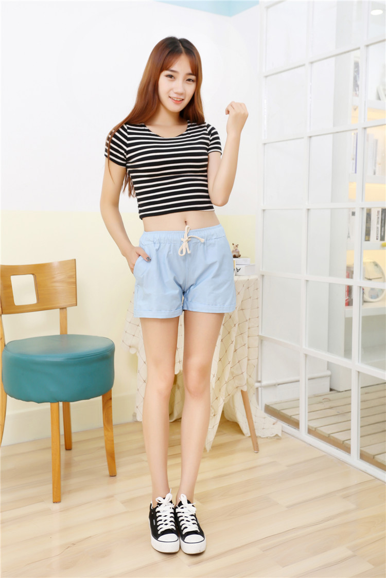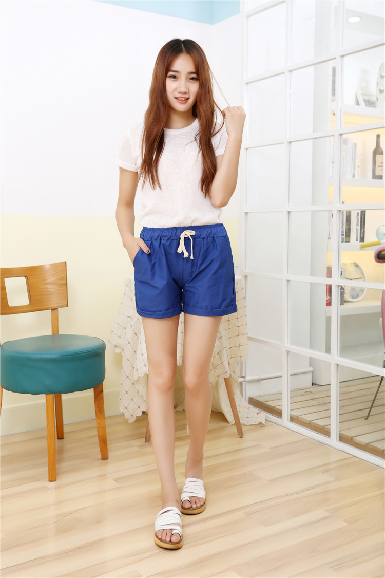2016女裝春款女士休閒純色松緊腰系繩卷邊短褲女式休閒短褲批發