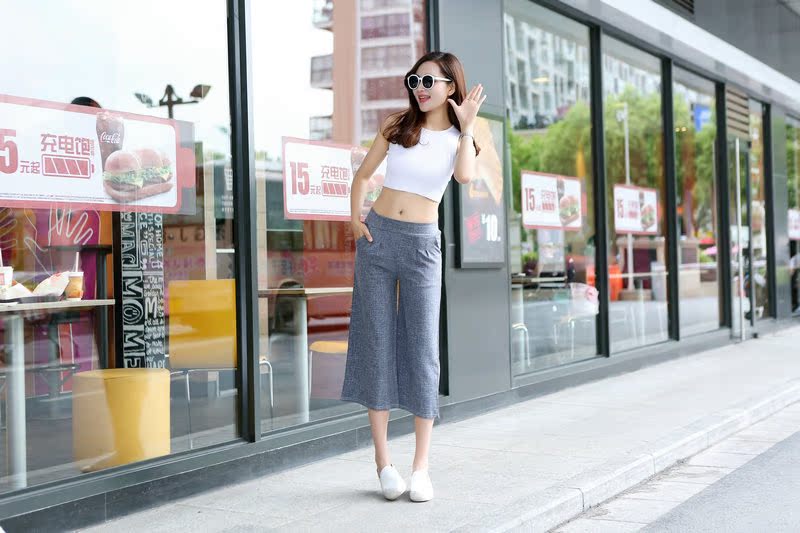 本季主推款麻灰格子系棉麻八分闊腿褲