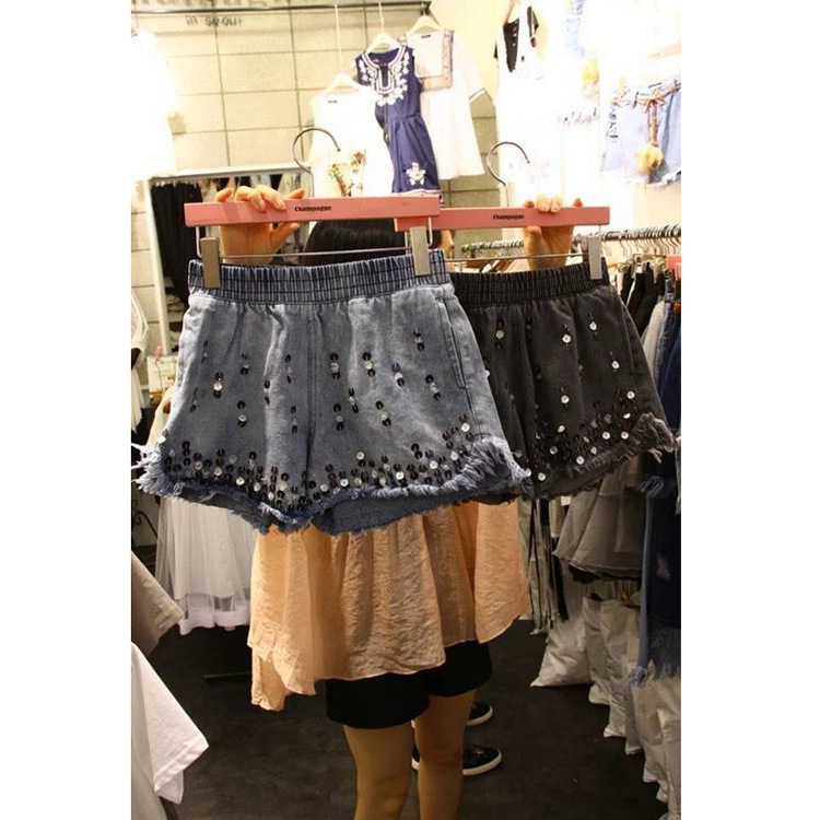 韓國東大門2016夏季新款 韓版松緊腰亮片毛邊牛仔短褲女闊腿褲_牛仔短褲_女裝_服裝_貨源_批發一路發