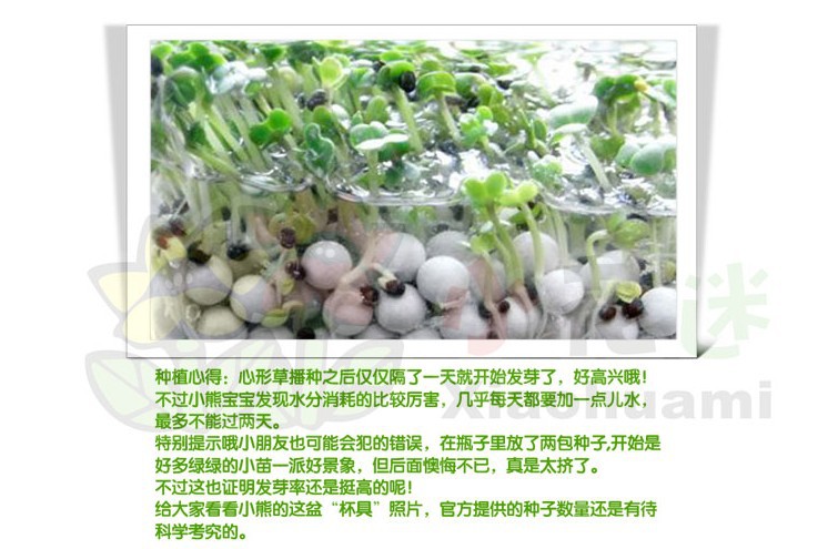 本公司產品為廠傢直銷。產品發芽率很高,一般按說明種植都可以發芽,運輸途中如有出現破損、提供證明24小時內聯系我們,一般會扣除可二次利用的東西價錢(包含不限於種子),將破損貨款退還給買傢,請放心購買!