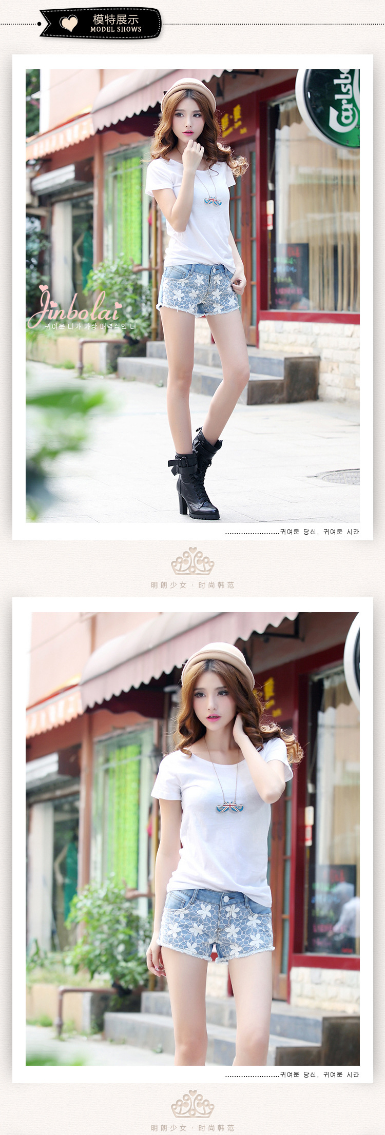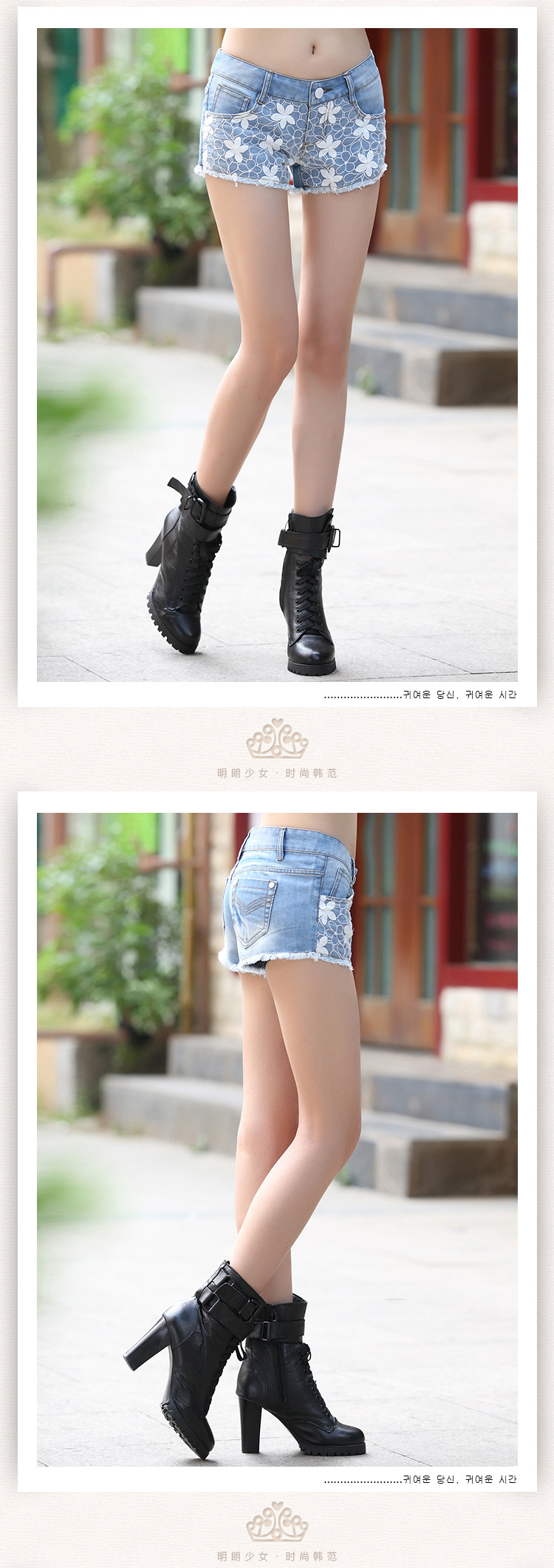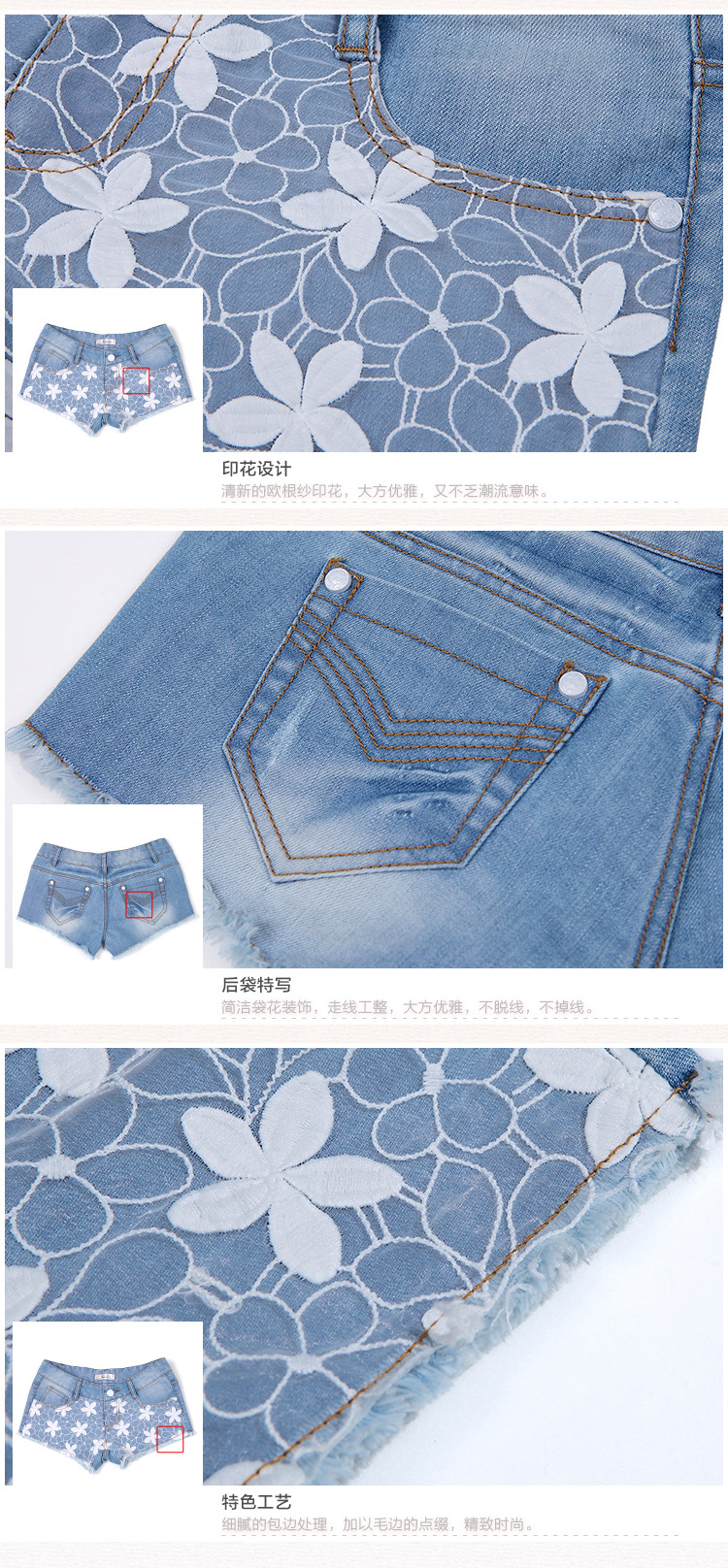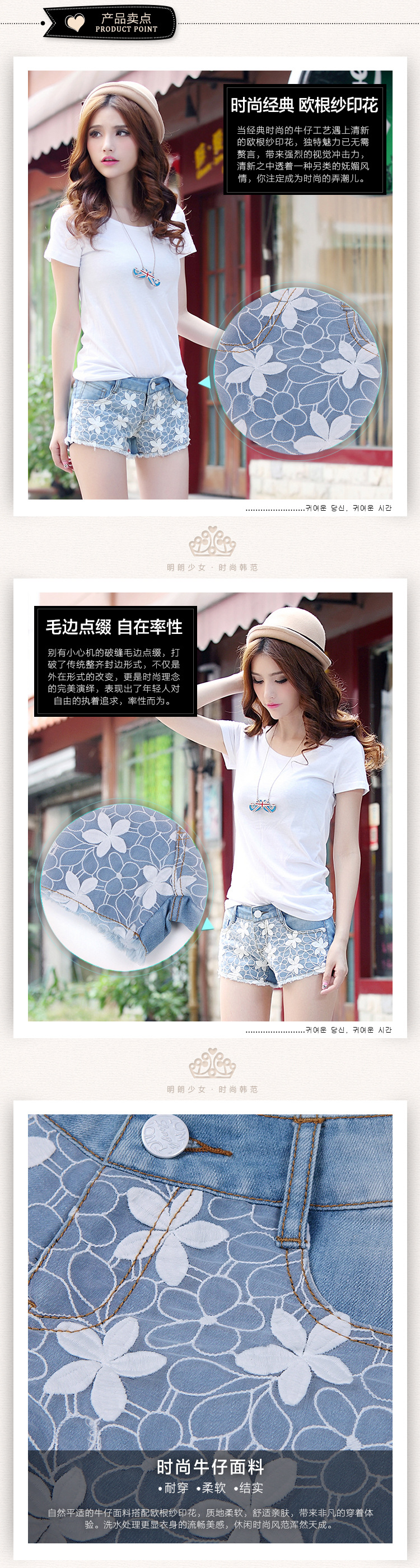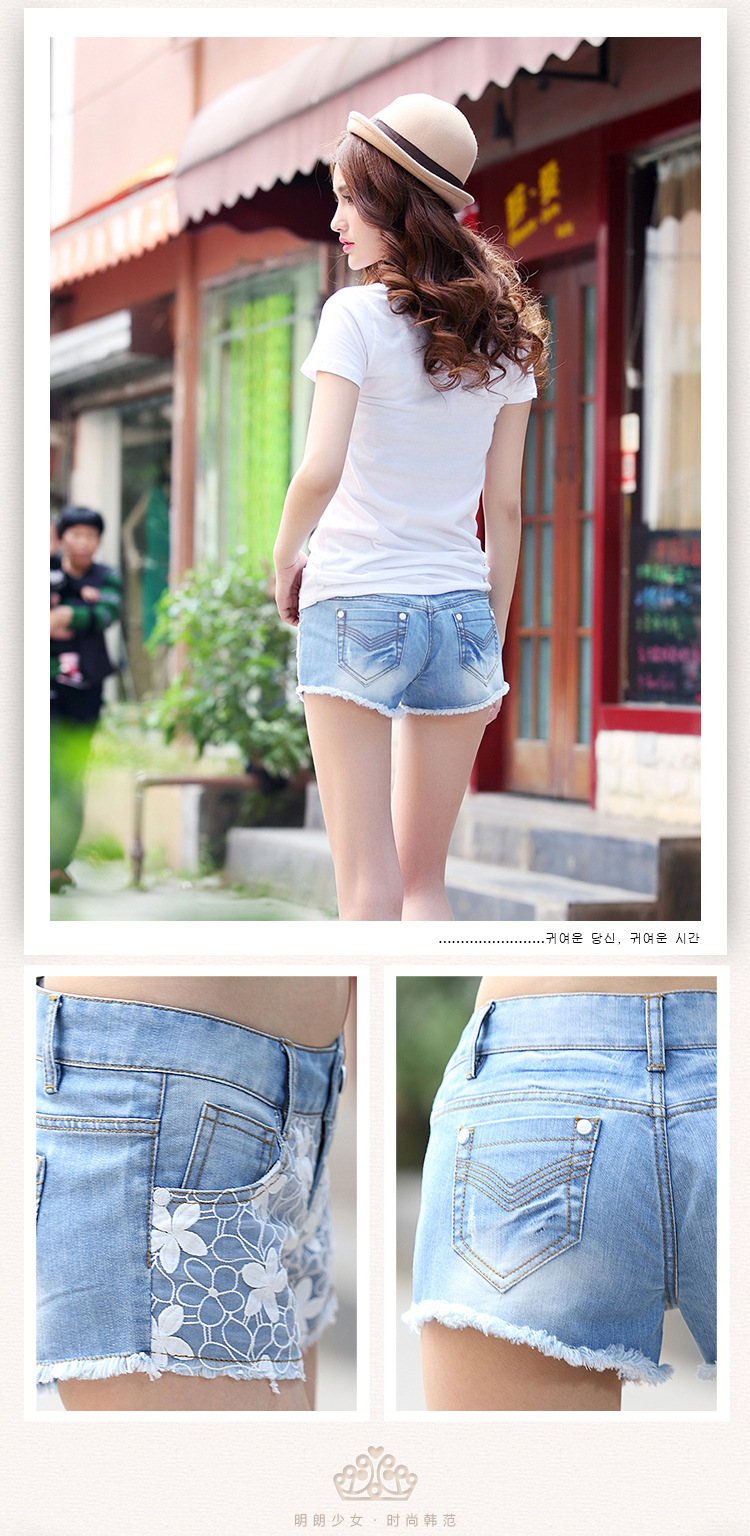 2016初秋新款韓版時尚牛仔褲 百搭修身毛邊蕾絲拼接低腰短褲