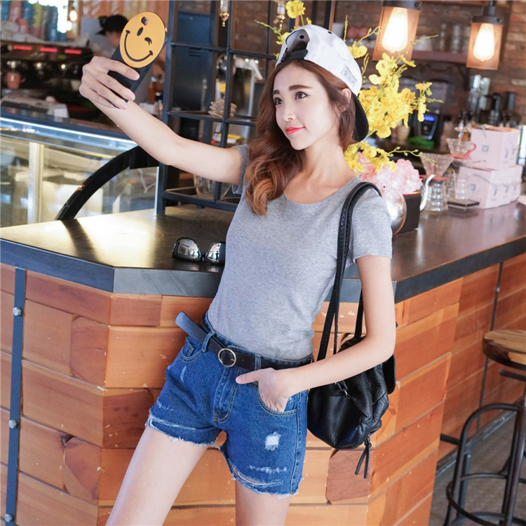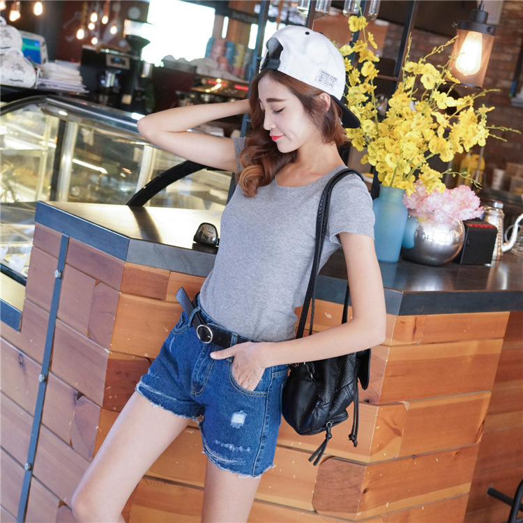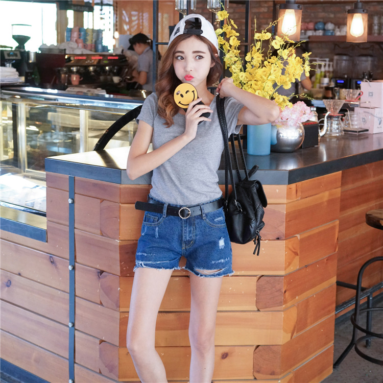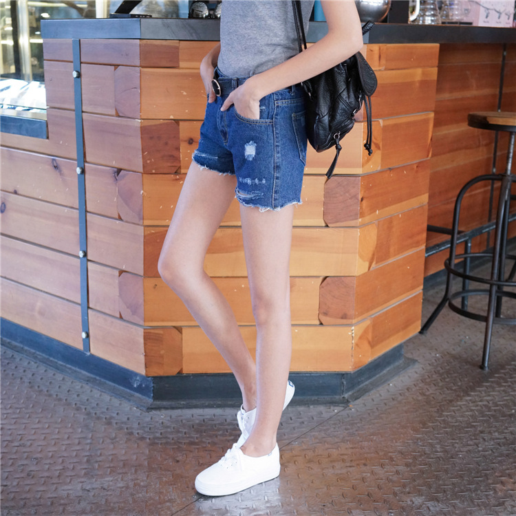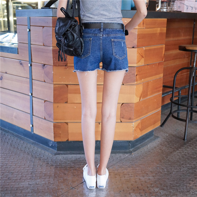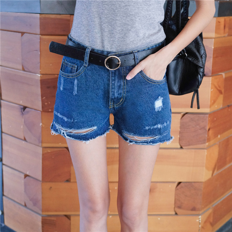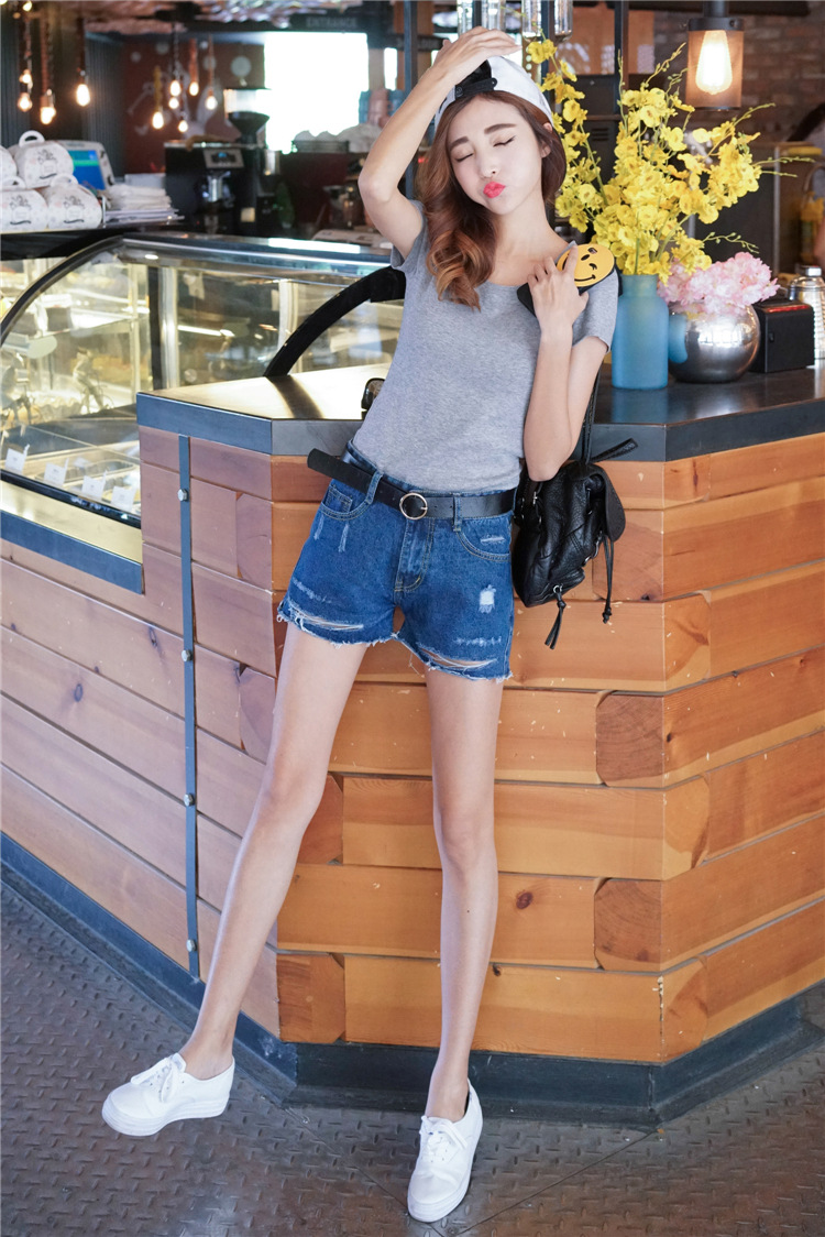 一款高腰的破洞牛仔短褲