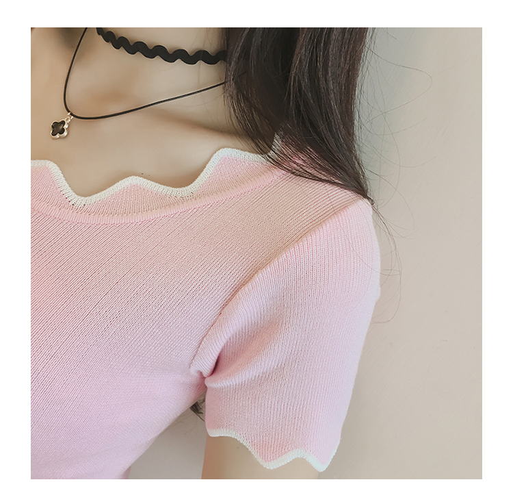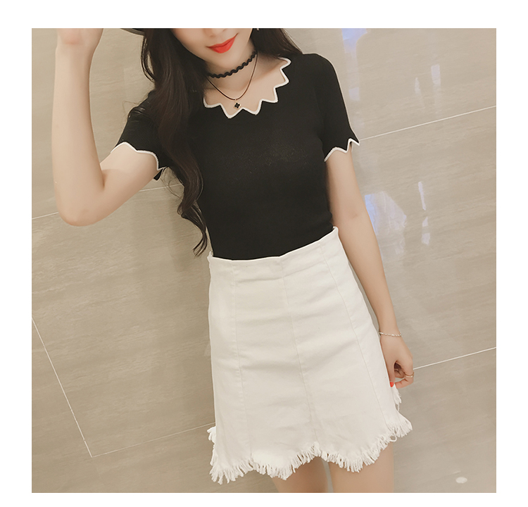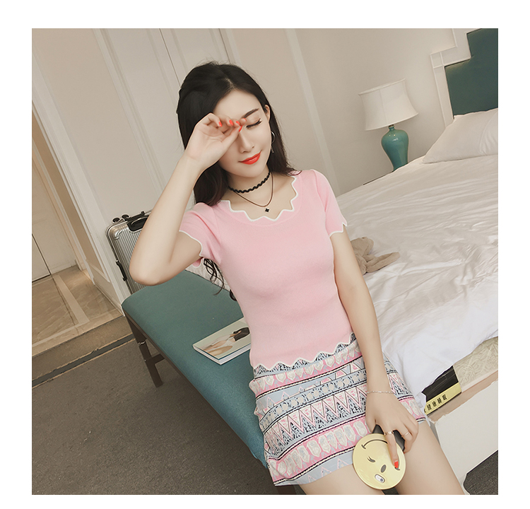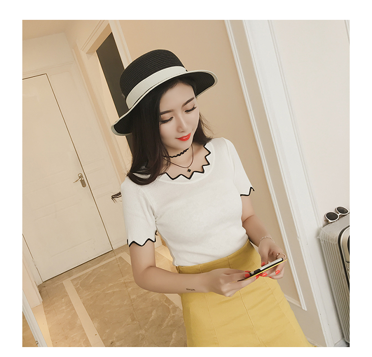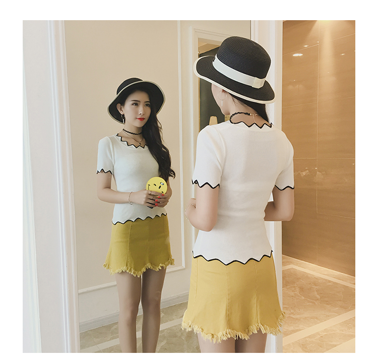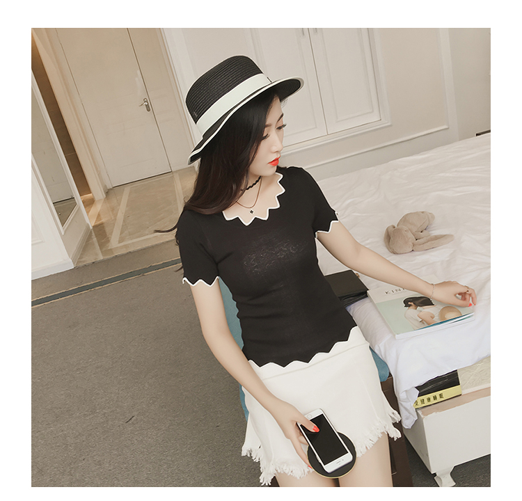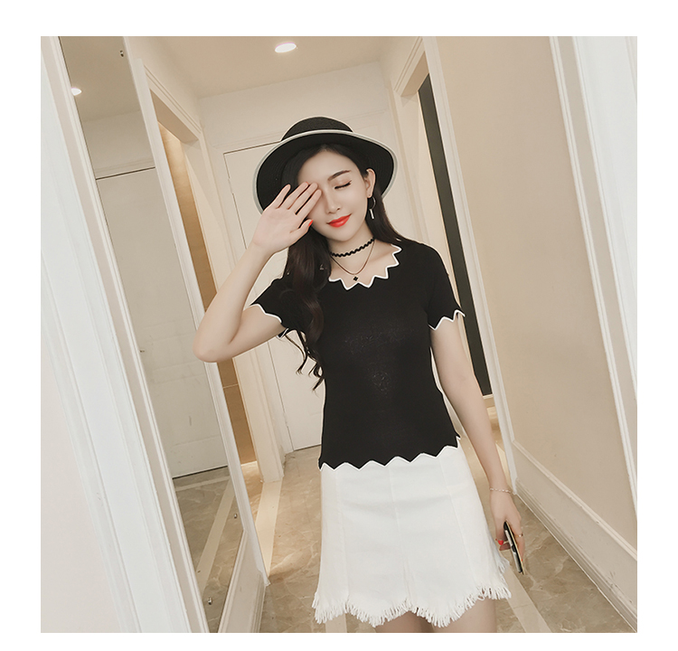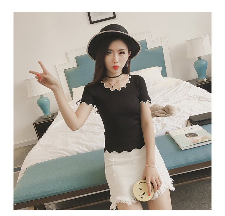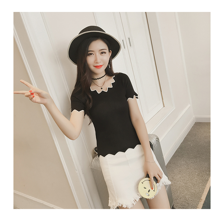 2016夏季爆款 韓版修身百搭不規則撞色波浪領針織衫短袖T恤女批發