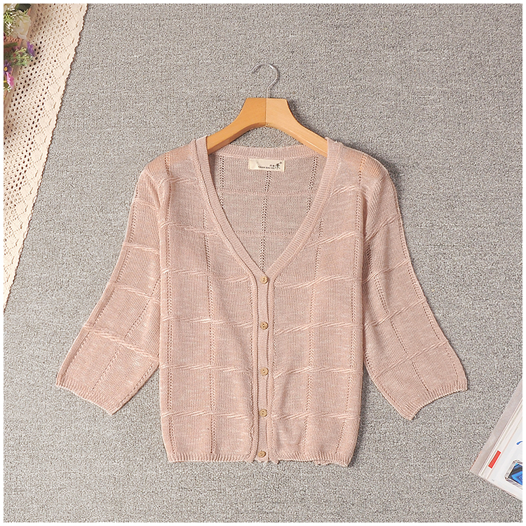 夏韓版V領七分袖薄針織衫短開衫 寬松麻料外套防曬披肩仟佰禾8860