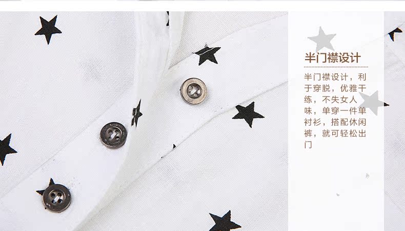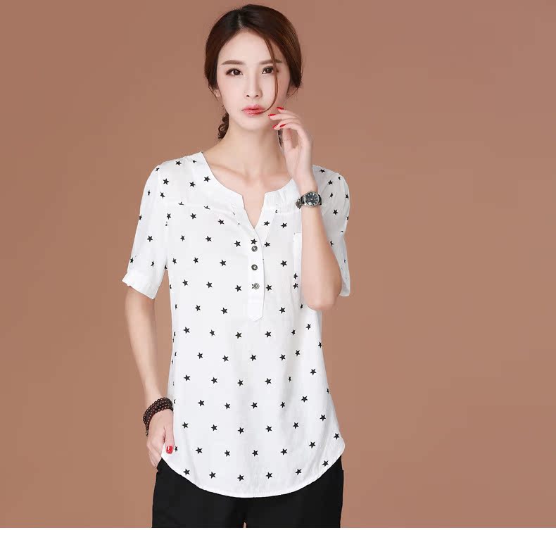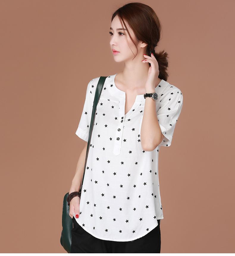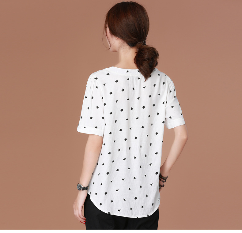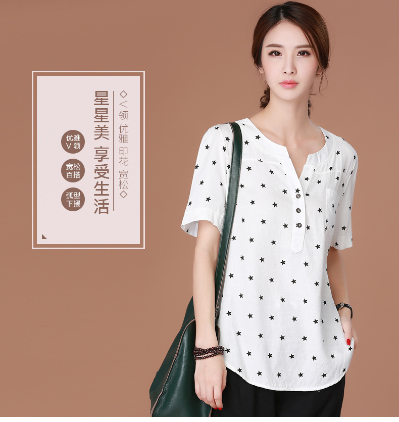 韓潮襲人2016夏裝新品文藝星星印花白襯衫女短袖寬松V領簡約襯衣