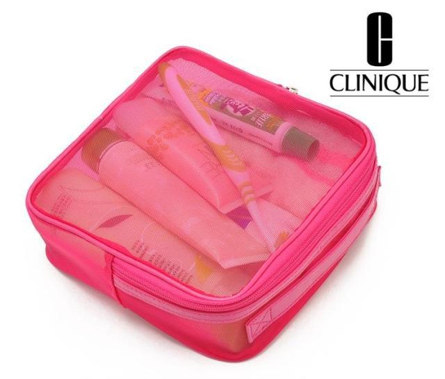 倩碧玫紅色網格方形化妝包 洗漱包 帶手拎