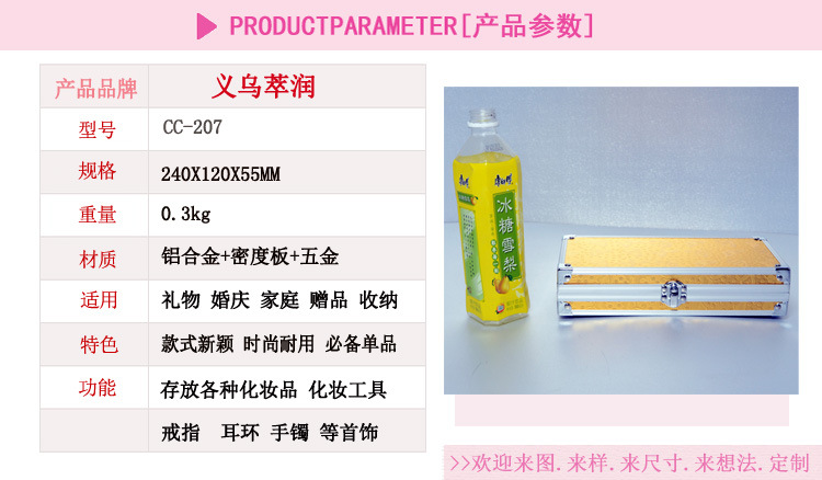 義烏市萃潤箱包廠,創建於2007年,位於中國國際小商品城——義烏市。本公司主要經營:工具箱、化妝箱、珠寶箱、提款箱、籌碼箱、航空箱、公文箱、旅行箱、醫療(保健、急救)箱、機器箱、樂器箱、文具箱、球箱、CD箱、煙具箱等各種鋁製箱包,以及來樣.來圖.來想法訂做不同型號.款式等箱子。