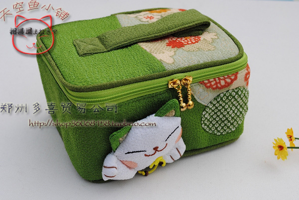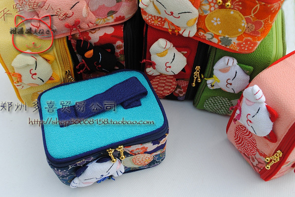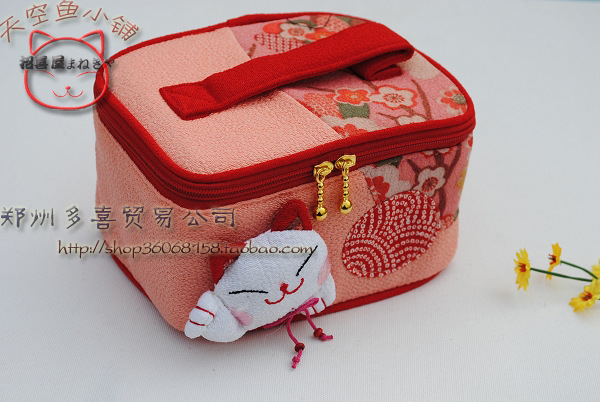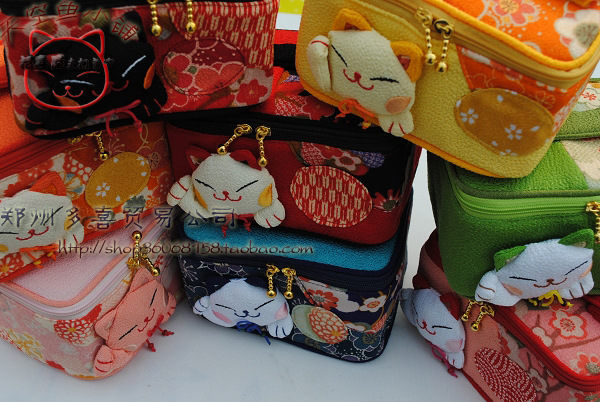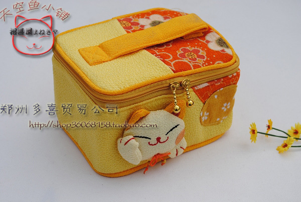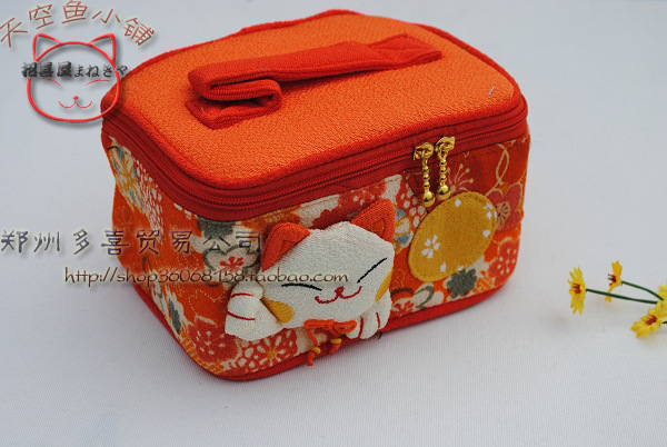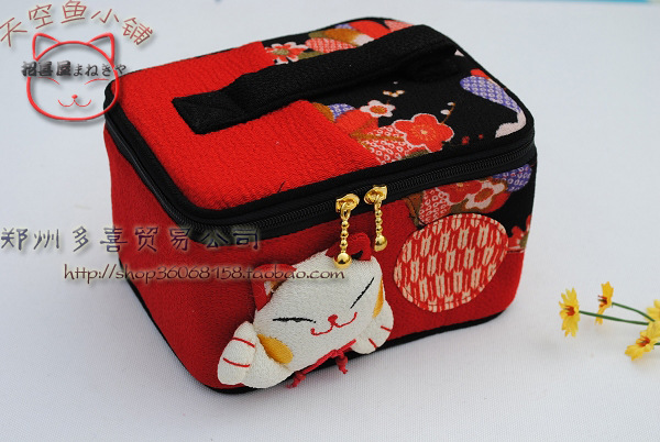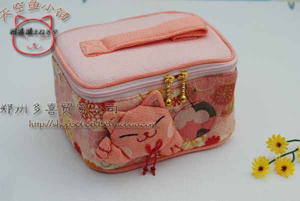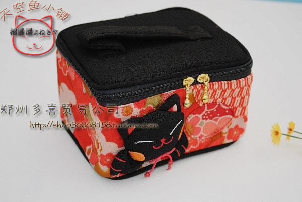 產品介紹:日單招喜屋化妝盒,盒子上有提繩,方便攜帶。前部綴有經典的招財貓形象,既可愛又實用。