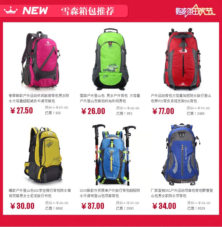 雪森箱包廠主要生產背包、登山包、腰包、休閒包、電腦包、學生包、工具包、禮品包及促銷用品等。並長期承接生產訂做各種內外單。更多款式請瀏覽雪森公司網站:www.bgxsxb.com電話:18931266967郵箱:[email protected]