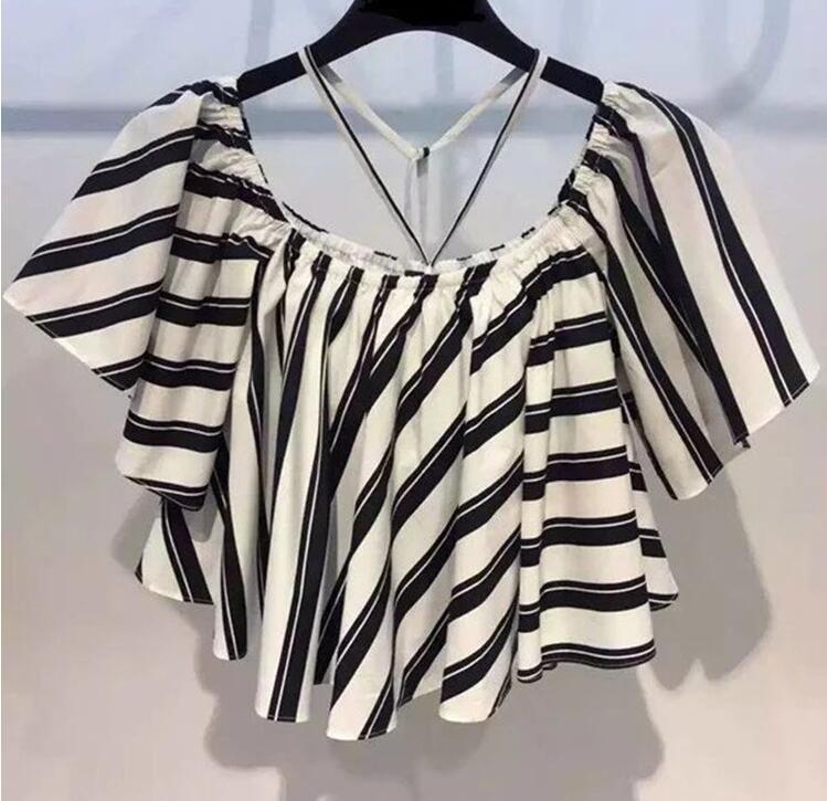 現貨2016新款夏裝女歐美短款寬松條紋一字領露肩T恤MA162SHT32
