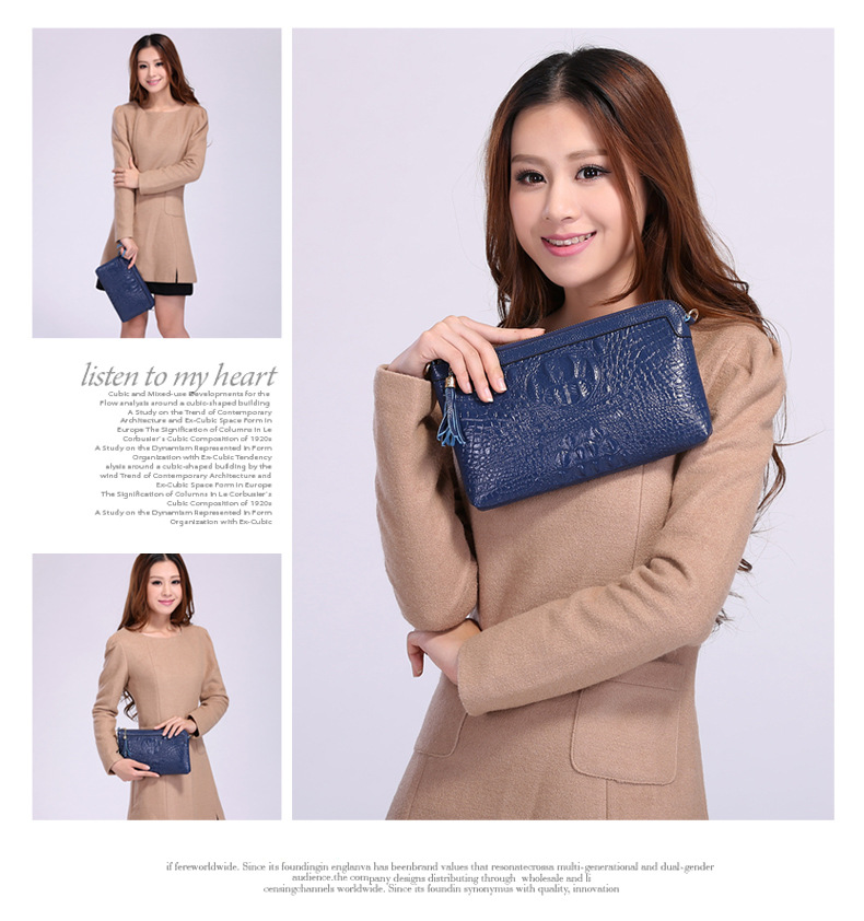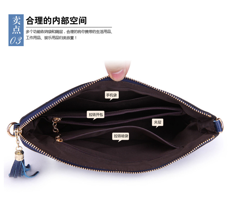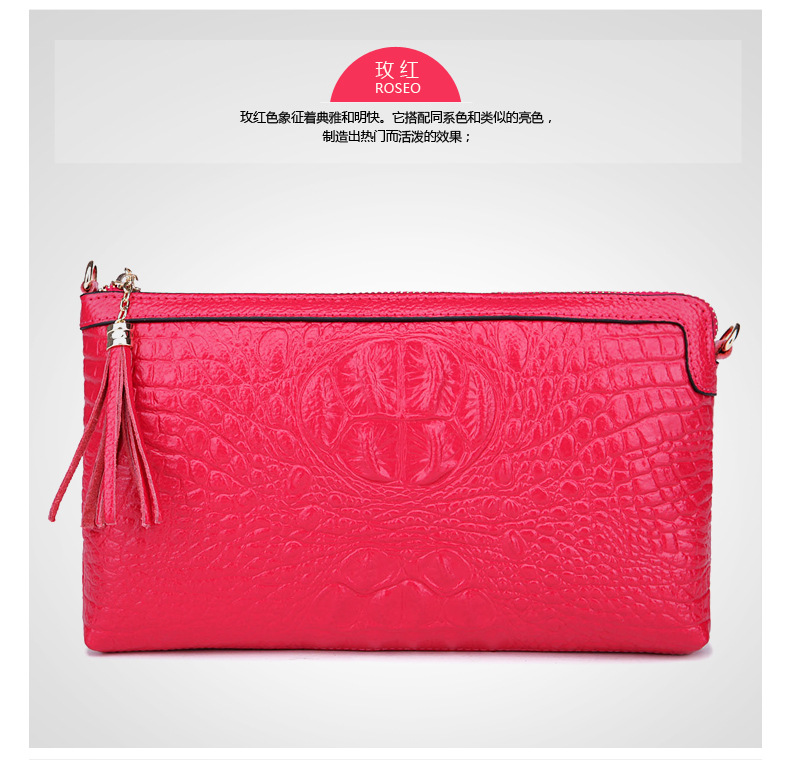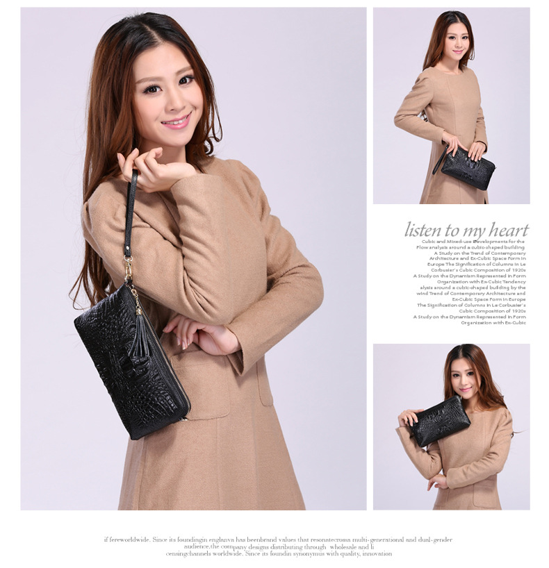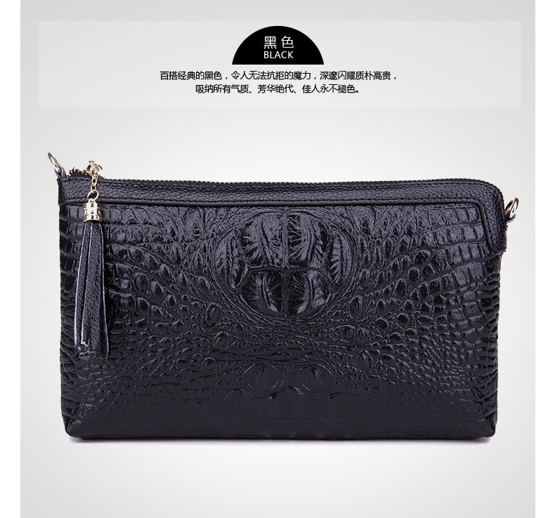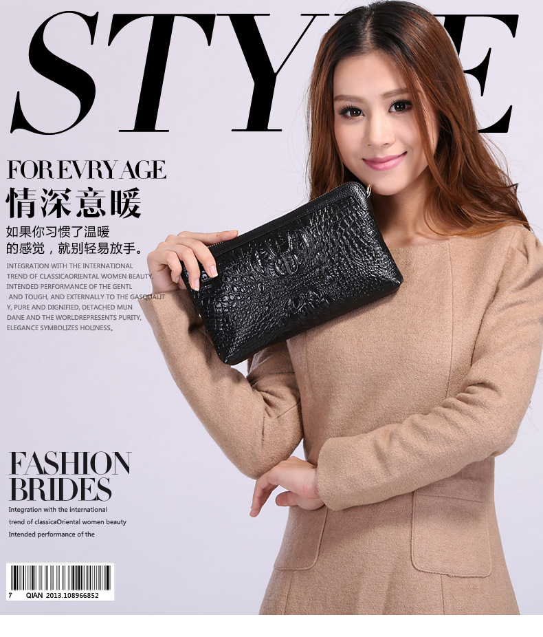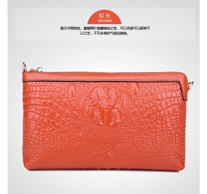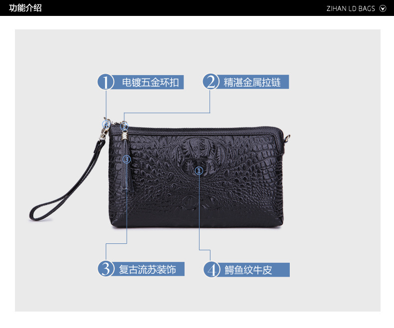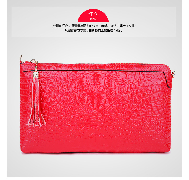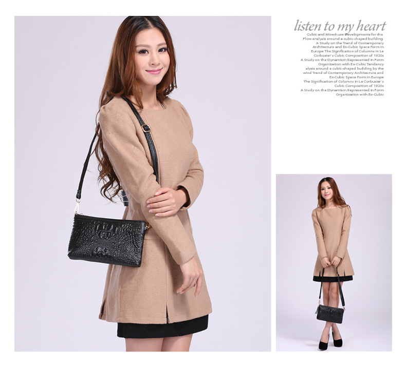 【功能】可平放百元大鈔,可放手機、零錢、票據、銀行卡、鑰匙等,隨身攜帶還可以放下小袋紙巾,簡單化妝用品等大容量空間,可滿足茶前飯後散步、逛街,宴會、約會等休閒之用,既可手拿、亦可單肩背、更可斜挎,一款女士多用途多功能不可多得的時尚休閒潮品。