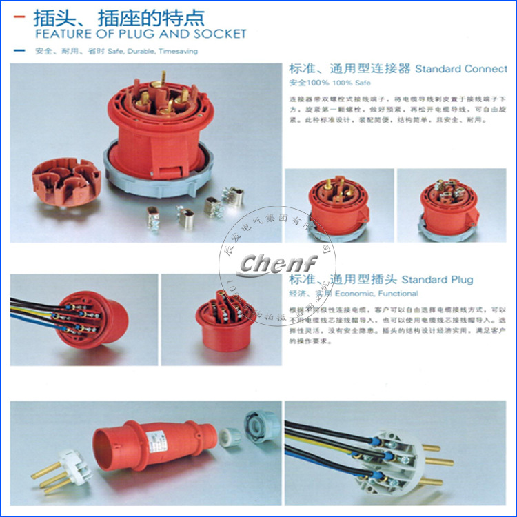 1.外殼:防水插頭,插座系列產品外殼都采用進口優質塑料(尼龍)製造,其正常使用情況下可達到90°C不變形,-40°C技術指標不改變。