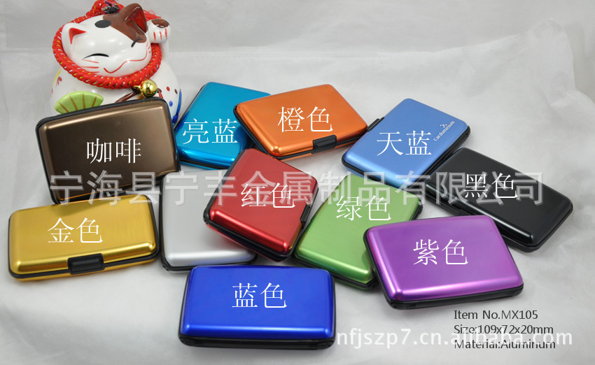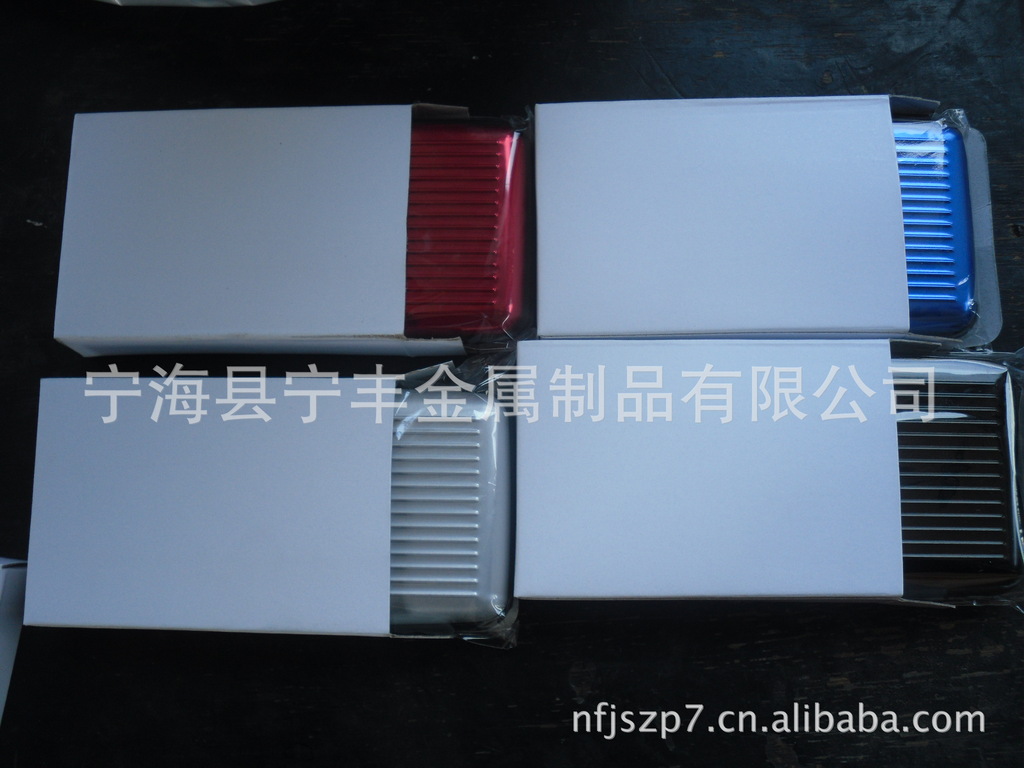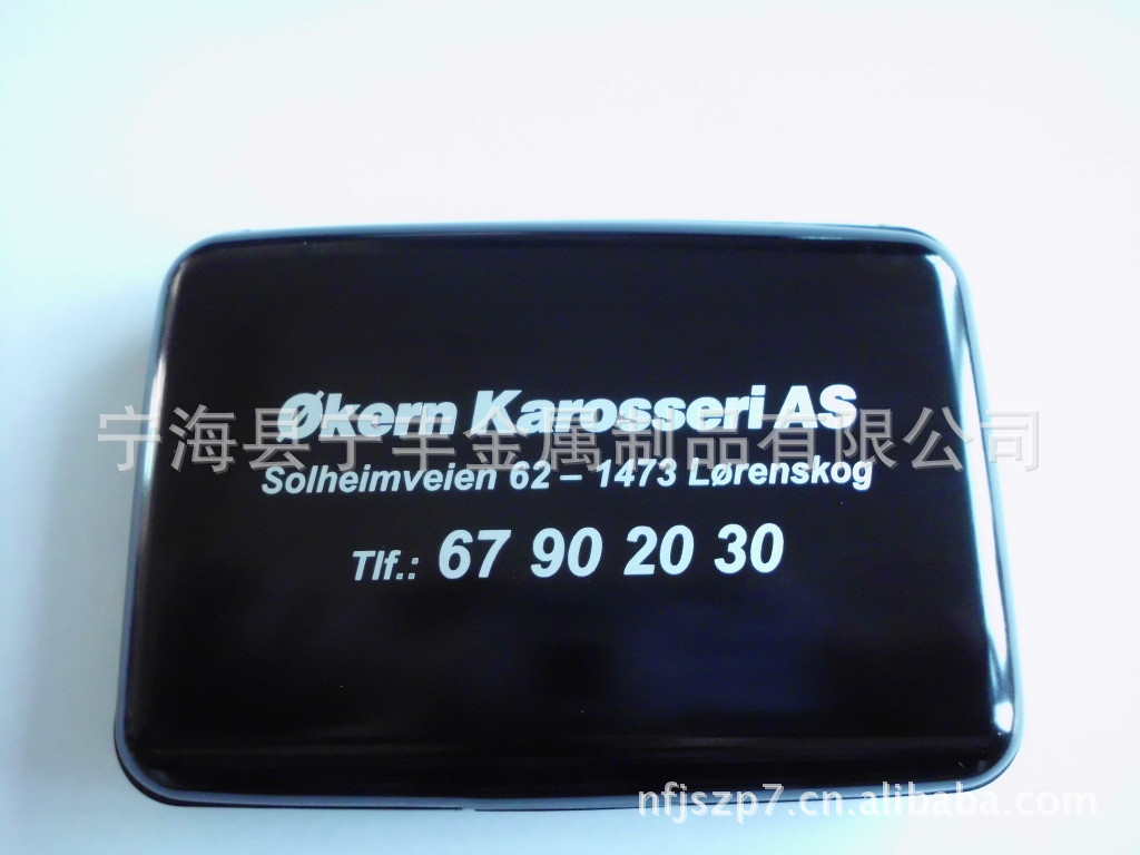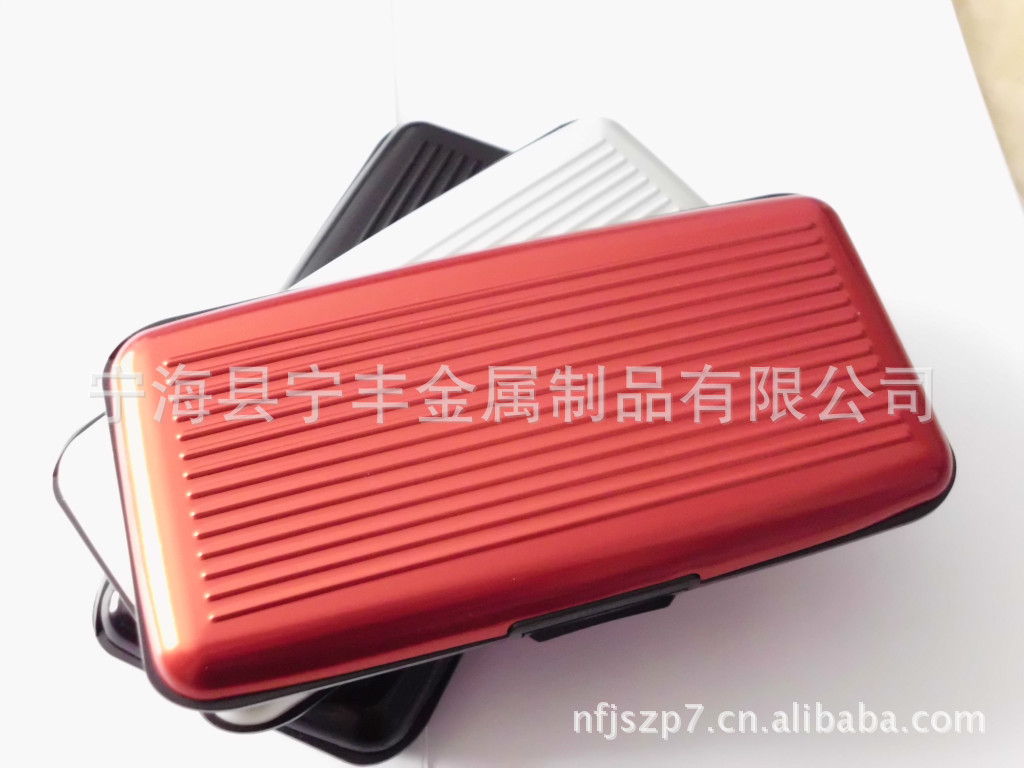 寧海寧豐金屬製品有限公司,自主研發生產信用卡盒,外形新穎時尚美觀,產品可做公司廣告促銷禮品,或做開業慶典紀念禮品贈送;產品可印公司LOGO,高品質/低價位/竭誠為您服務! 歡迎全國新老客戶來電來人咨詢洽談業務。生產的高檔信用卡盒、名片盒、便簽本系列采用上下開合式結構,使用時雙手輕輕用力,便可輕松打開,精密的配合間隙,加之精湛的製造工藝及鋁合金材料特有的輕、薄、小、巧的特性,攜帶使用方便。主體部分可根據客戶要求印刷、激光醒目廣告,便於企業產品促銷或作為企業推廣之用途。表麵可根據客戶要求彩色氧化。歡迎廣大客戶選購訂做! 公司生產的金屬名片盒系列,采用上下開合結構,使用時輕輕用力,便可輕輕打開,精密的配合間隙,加之精湛的製造工藝及鋁合金材料,特有的輕薄,小巧的特性,可以容納6-21張卡片,攜帶使用方便。是現代女性不可或缺之生活用品,表麵可跟據客戶要求彩色氧化,熱轉印。產品可跟據客戶要求LOGO.印刷,激光醒目廣告,便於企業產品促銷或作為企業推廣。