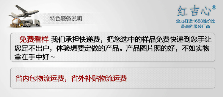 紅吉心服飾致力於用性價比更高的產品,更優質的服務,打造阿裡巴巴網第一工裝服務平臺!