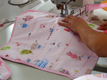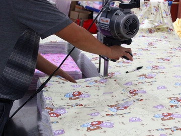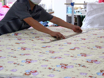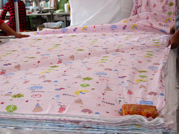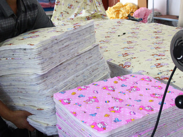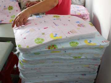 1.先把佈匹原料3層碼好切斷; 2.劃好尿墊規格尺寸;
