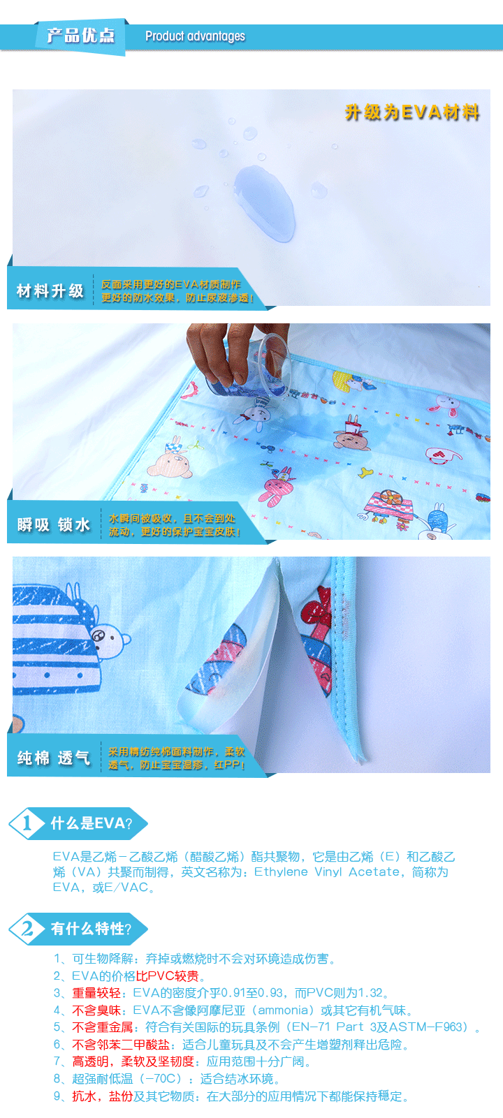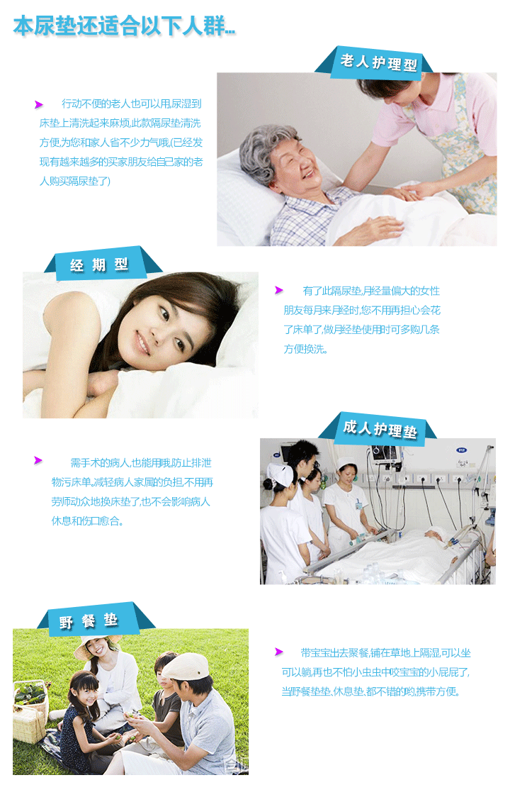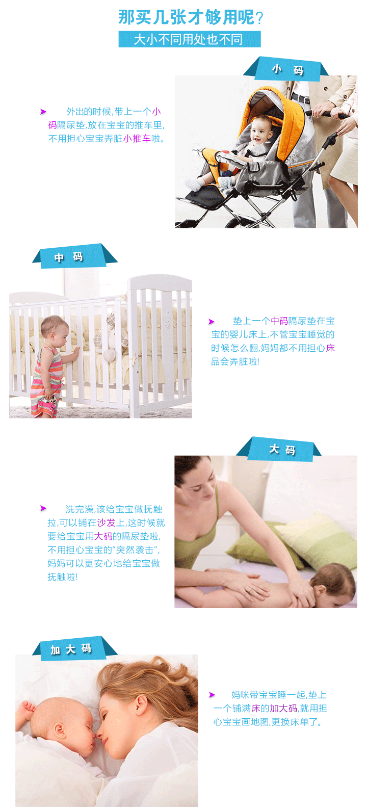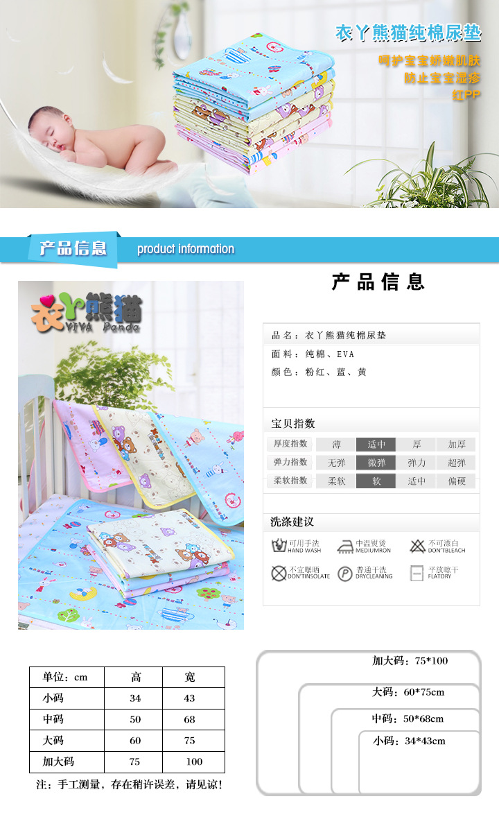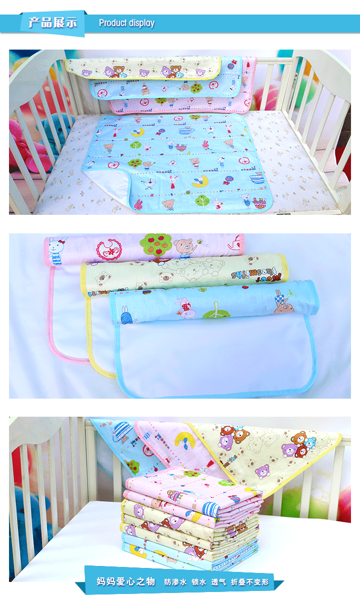 更多關註:隔尿墊不是紙尿褲,也不是尿佈,它的主要作用是隔離尿液,以保證下麵的褥子或床墊不被尿液浸濕,隔尿墊濕瞭最好立即更換,以保證寶寶的屁股乾爽。