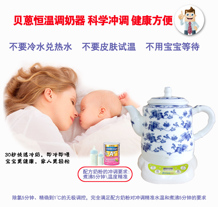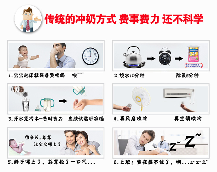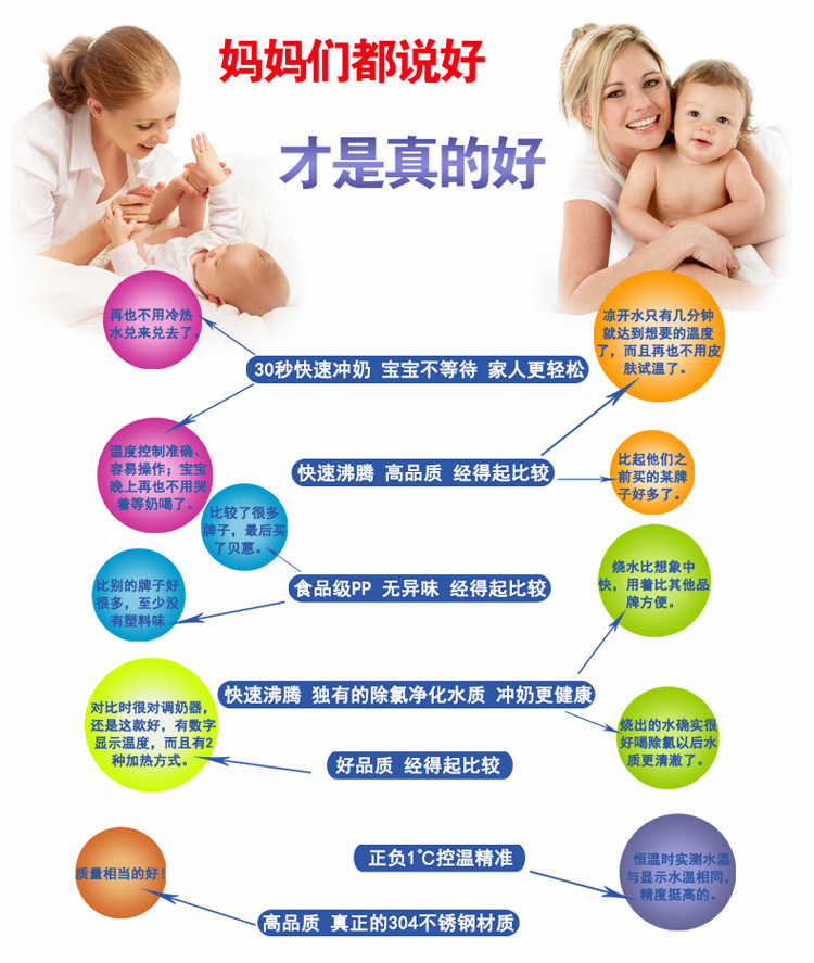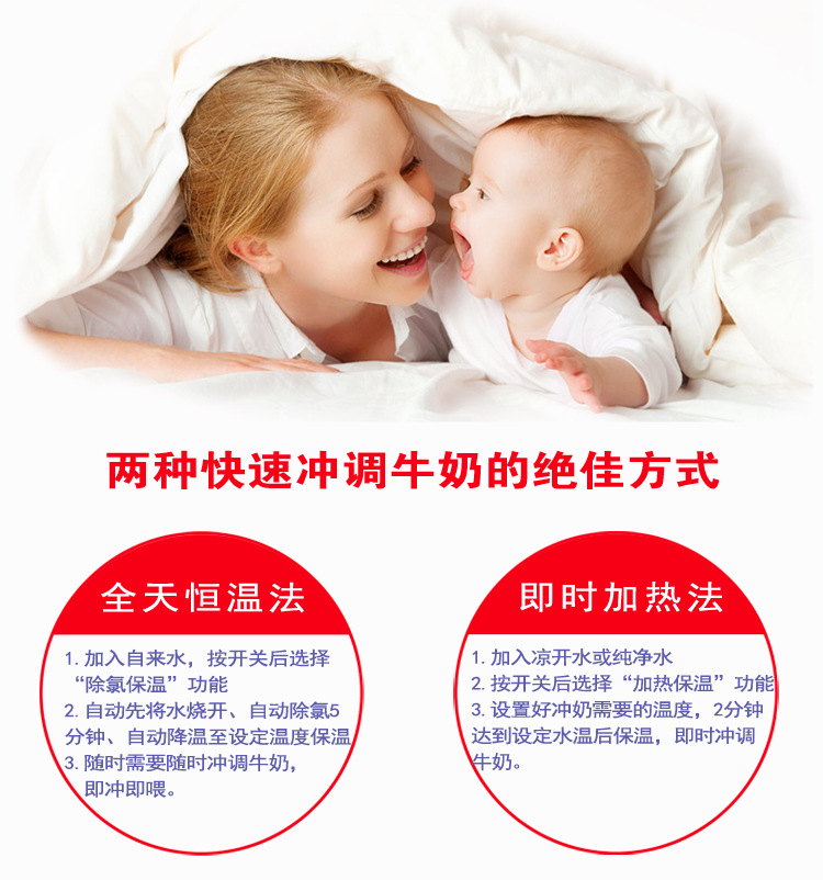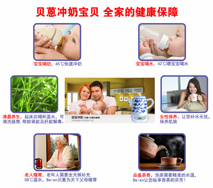 4、年青人與老年人用來乾什麼?年青人與老年人可以用此沖奶寶貝來保健養生,如年青人每天早晨的養生水,每天早晨喝溫開水一杯,即可清理腸胃,還可以起到水療的作用,老年人在冬天的時候需要喝溫開水,但開水太燙,冷水太冷,而貝蒽沖奶寶貝可以根據您的需要設定您最合適即沖即喝的溫度24小時恒溫,而且是一設定,長期使用。