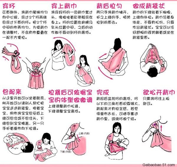 6、工作、育兒兩不誤——背巾將媽媽的雙手解放出來,媽媽可以同時乾其他事務。特別方便需要邊育兒邊工作的媽媽。背巾中的寶寶一般都會很安靜地觀察媽媽的舉動。