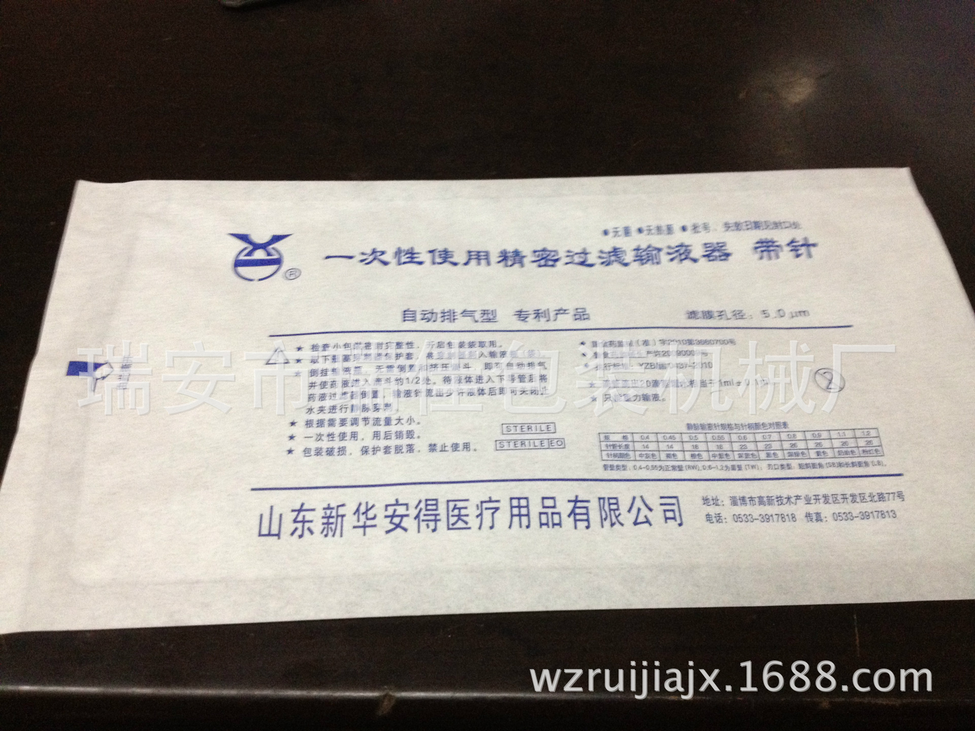 鑒於國傢對一次性輸液器、註射器包裝實施新的標準,為瞭配合生產和使用一次性輸液器、註射器包裝的廠傢達到新標準,我廠在電腦製袋機的基礎上,結合國內外先進技術,研製成功瞭機、電、一體化設備——TDCQ-300型電腦自動透析製袋機。該設備極光控防料、薄膜單麵沖孔、自動沖壓成型、自動粘貼、光電跟蹤、自動封切、電子記數等功能於一體,是生產透析紙性輸液器袋和註射器袋的理想設備。